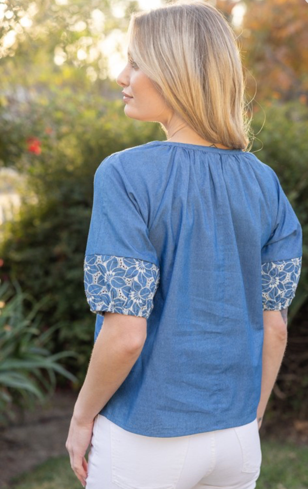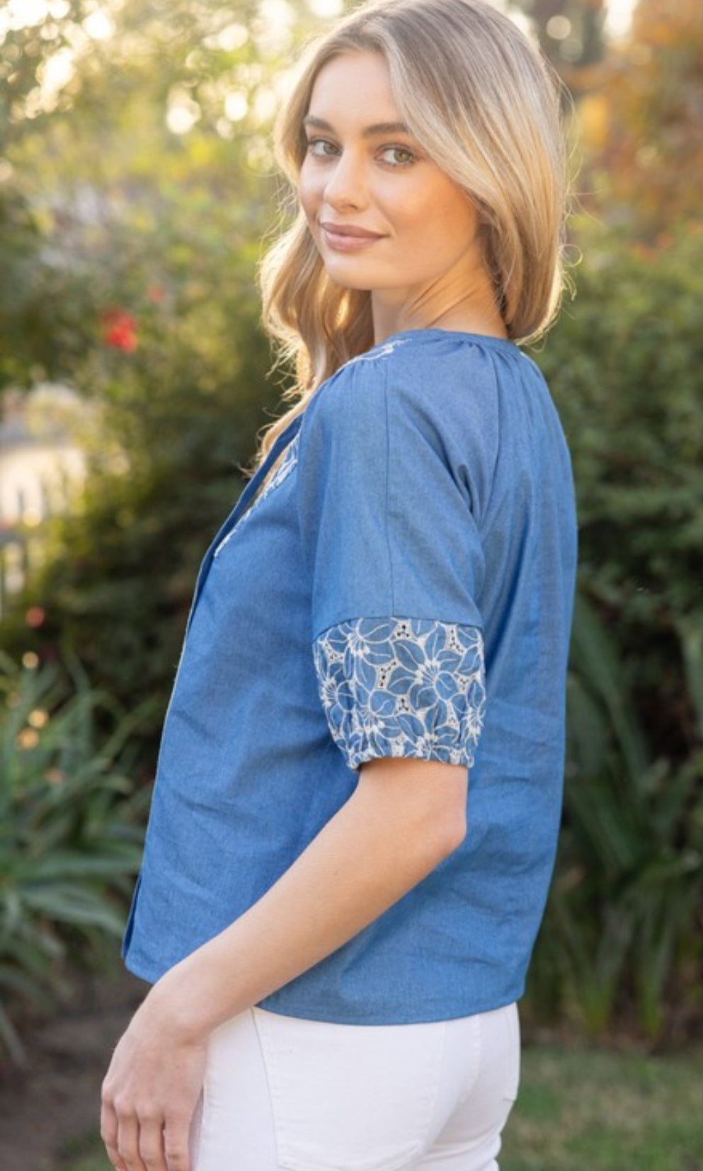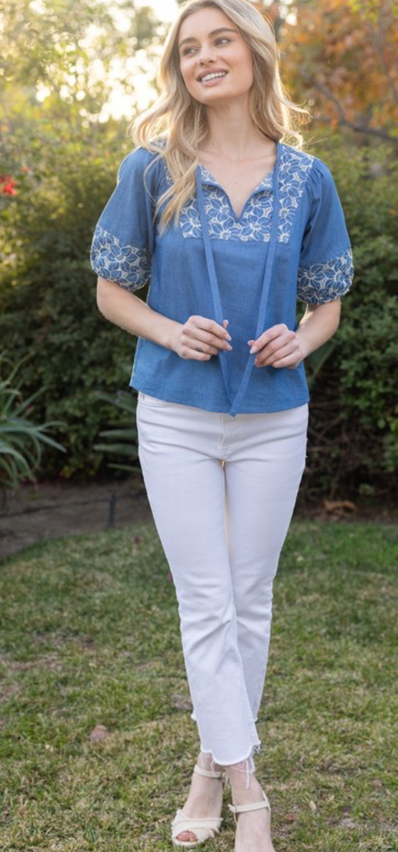 Floral embroidery detail top with tie. Accent on yoke and sleeves.