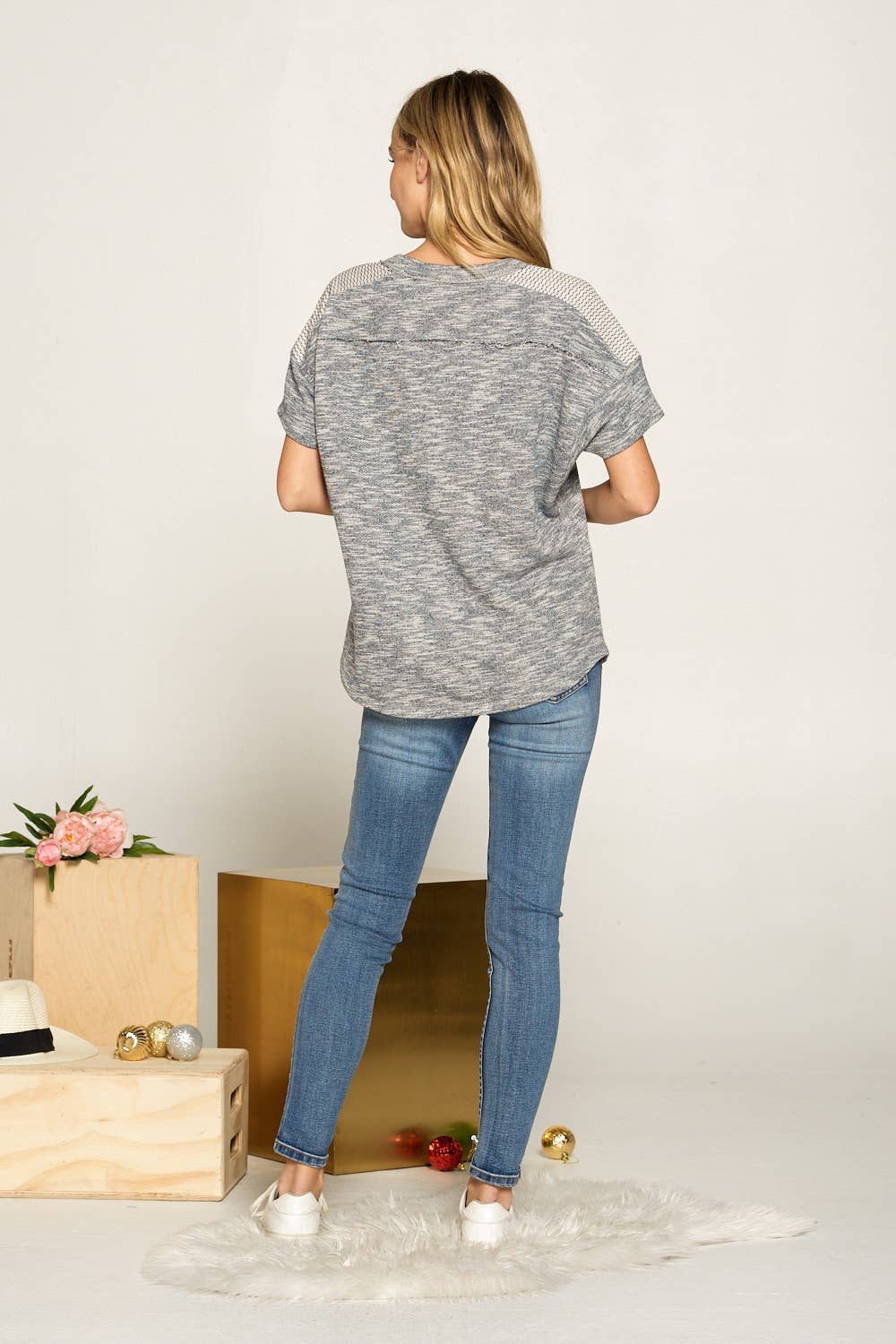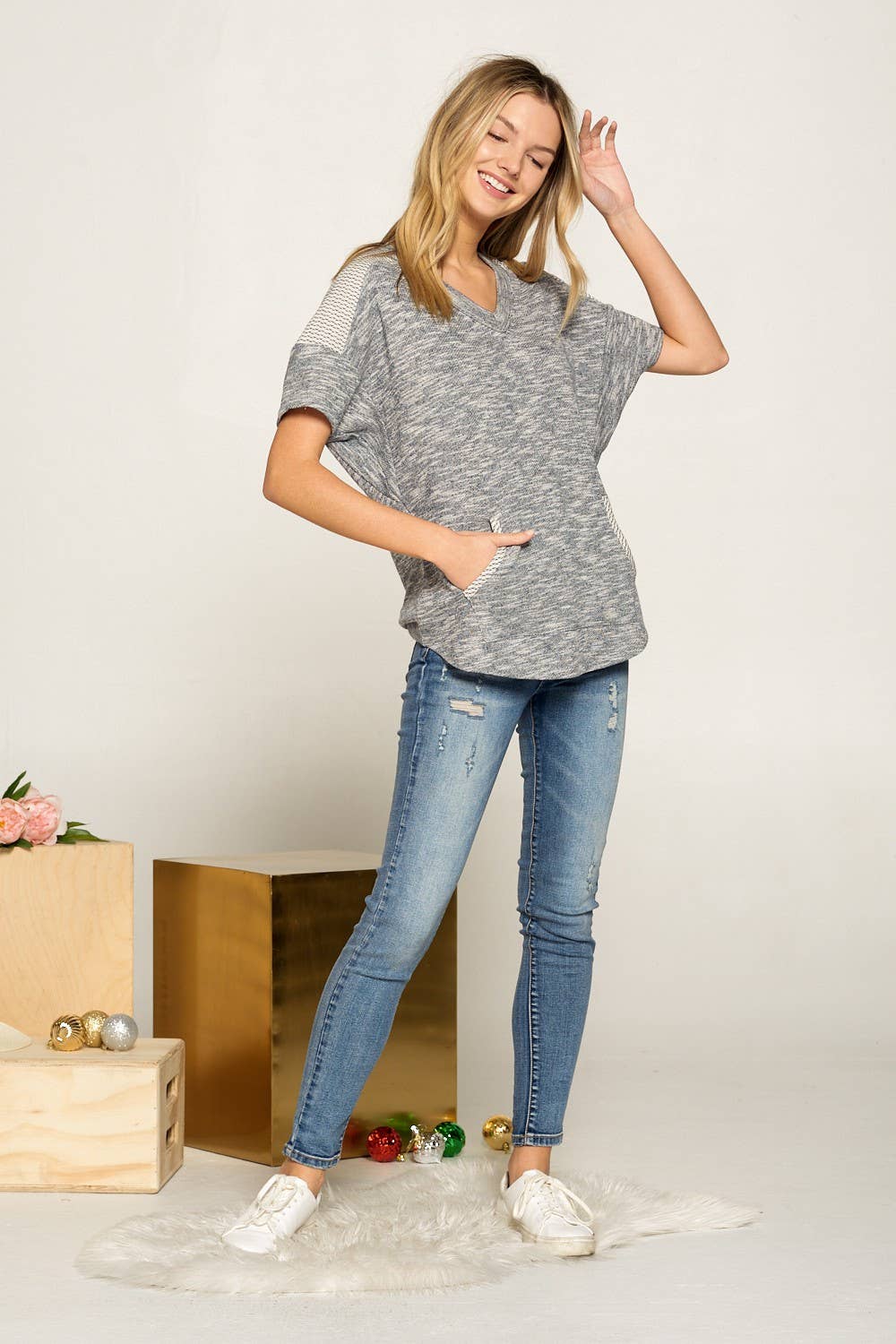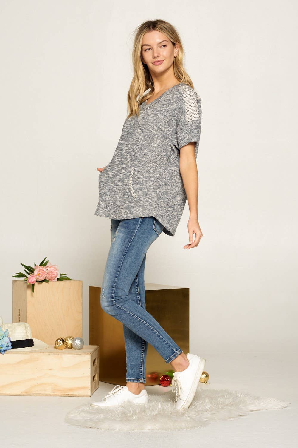 Checker yoke deep v neck pull over, self:80% Cotton, 20% Polyester | cont:100% cotton