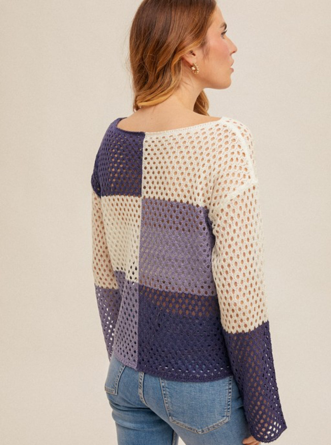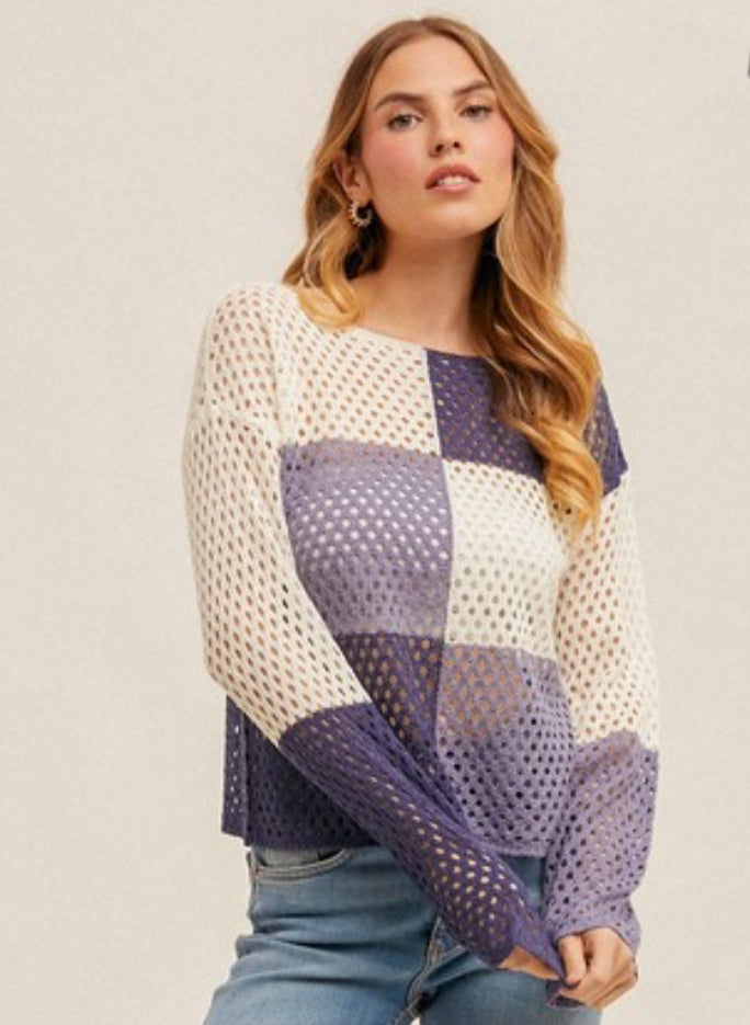 Colorblock open knit in dusty blue and deep blue. Boat neck. This will be fabulous all season long!
