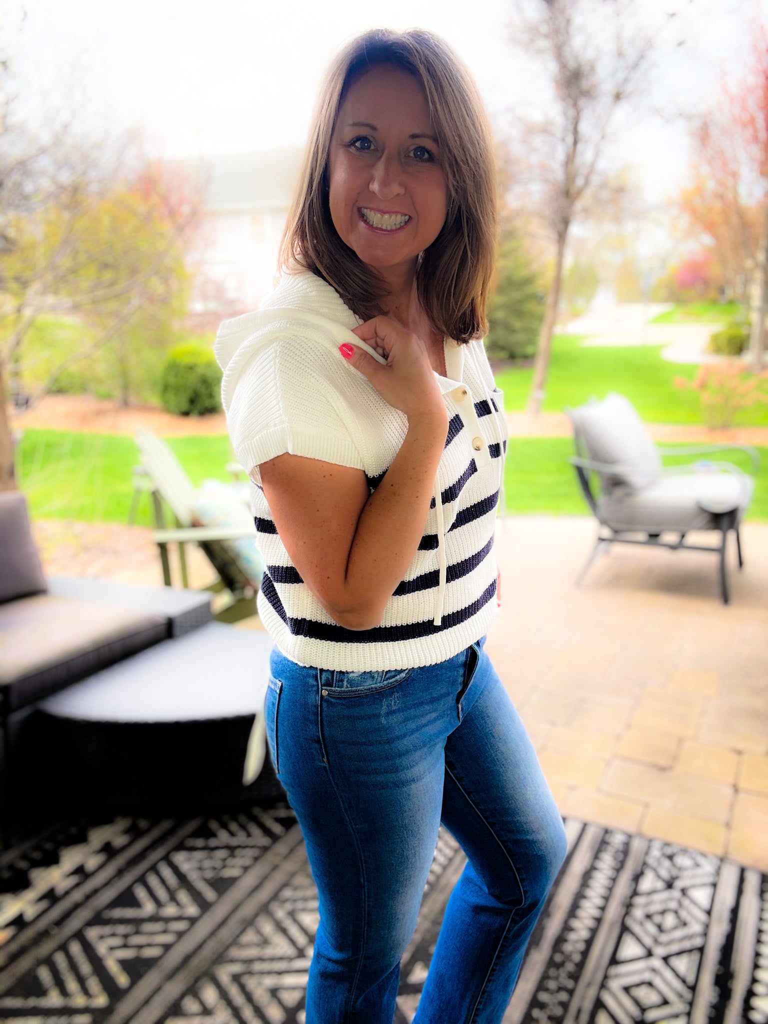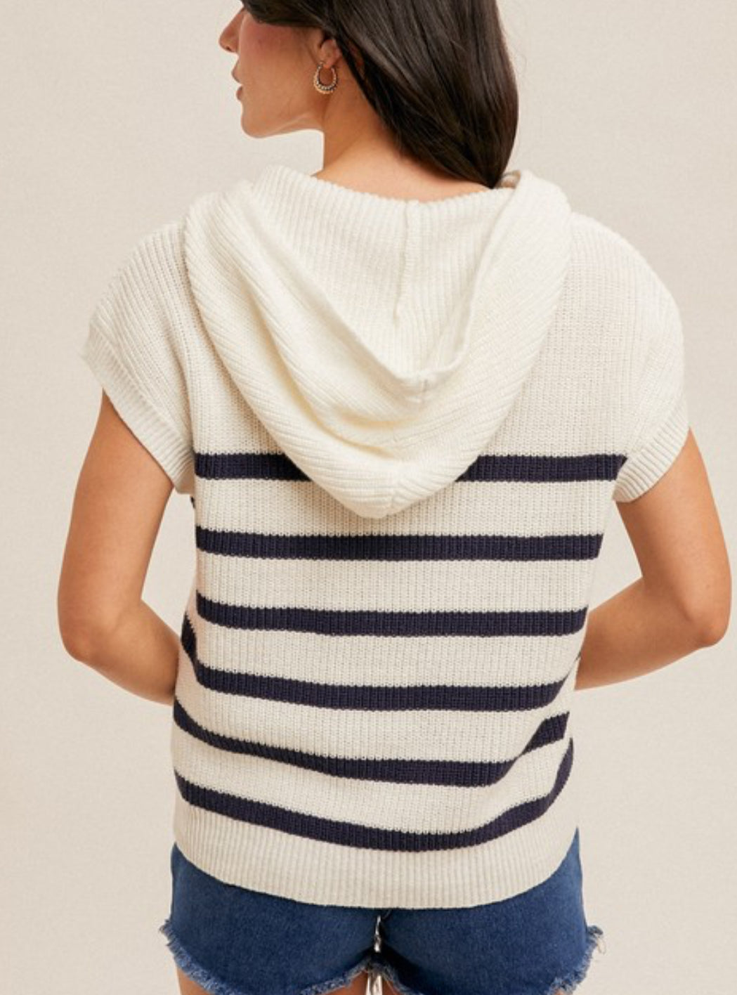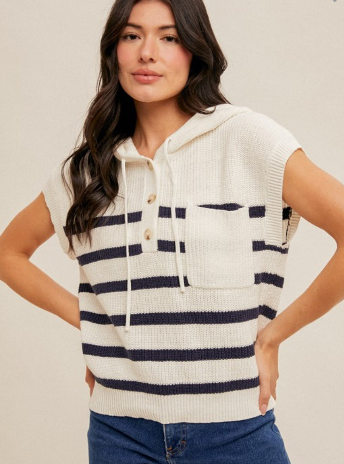 White with Navy Stripes. Dolman sleeve hoodie sweater. So easy to wear! Dress up or down!
