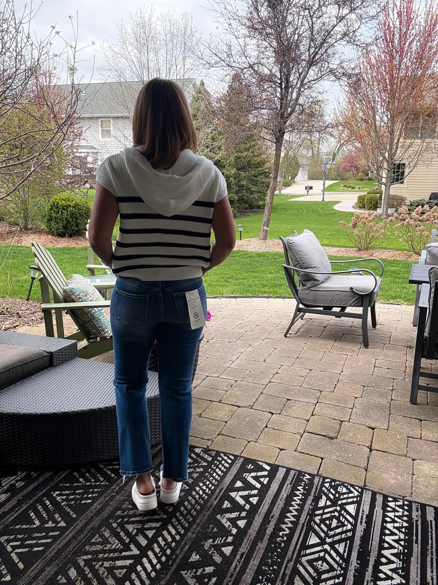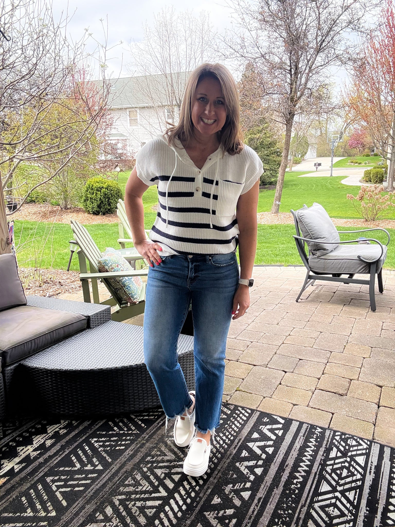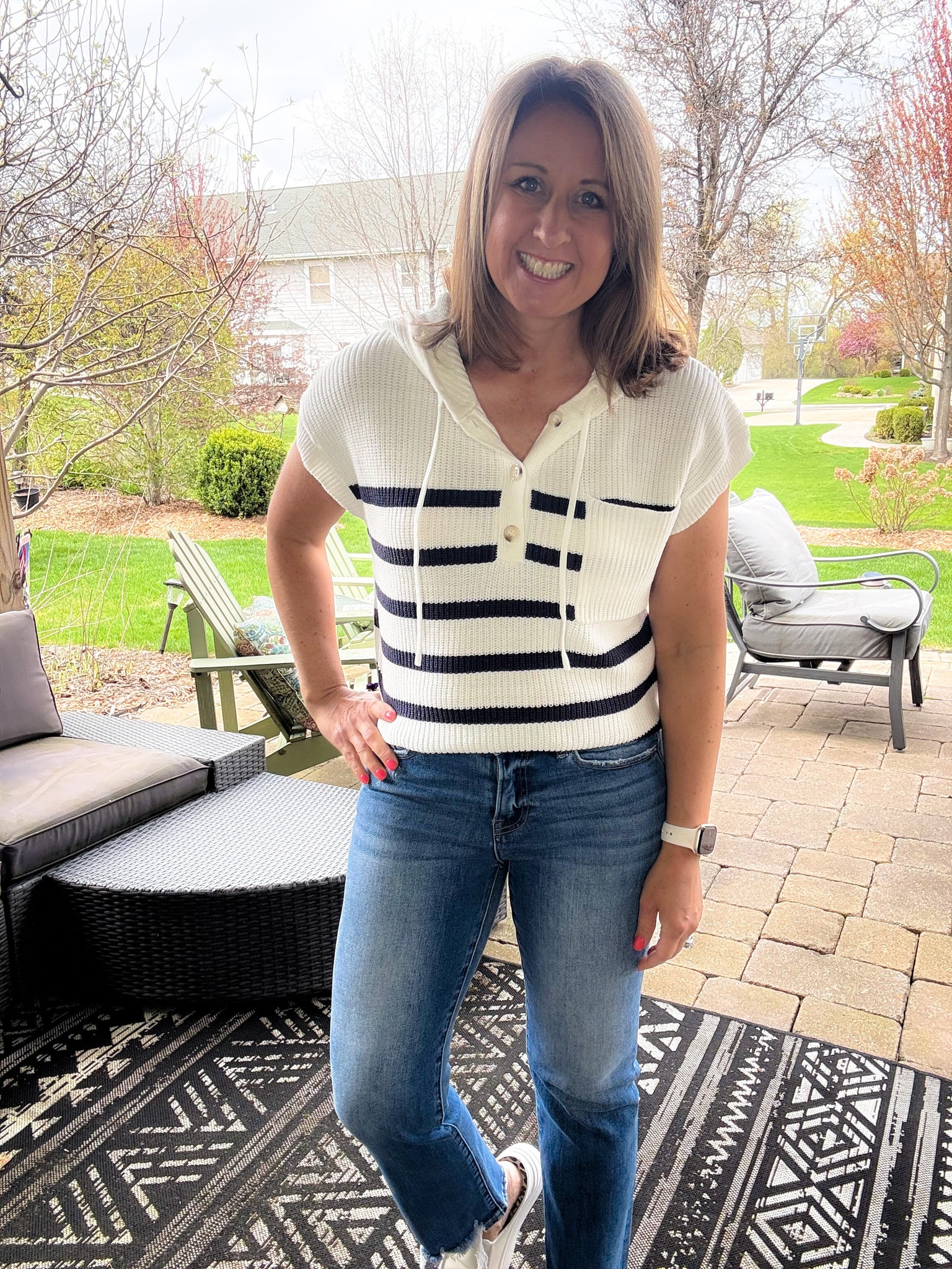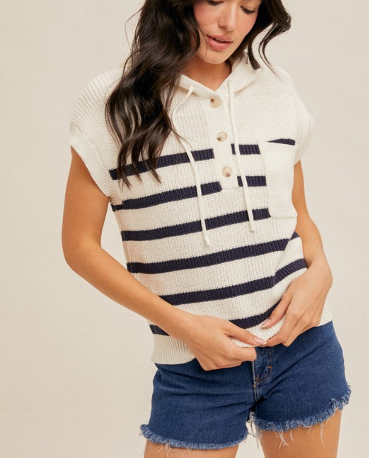 White with Navy Stripes. Dolman sleeve hoodie sweater. So easy to wear! Dress up or down!