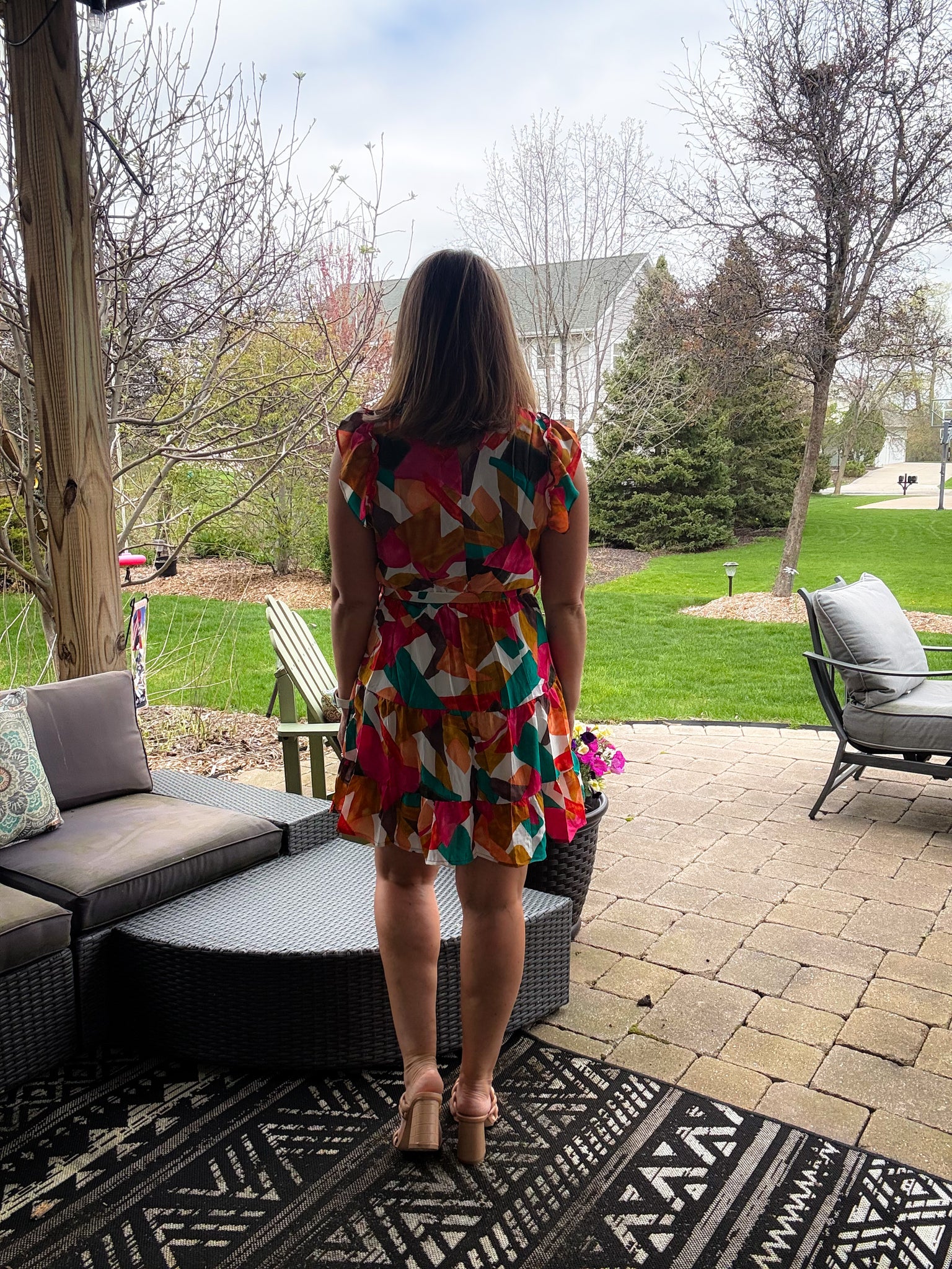 Abstract Print Round Neck Tiered Dress with Ruffle Sleeves, Ruffle Trim Neckline & Waist Tie Detail Along with Back Button Keyhole. Lined. 100% Polyester Read more