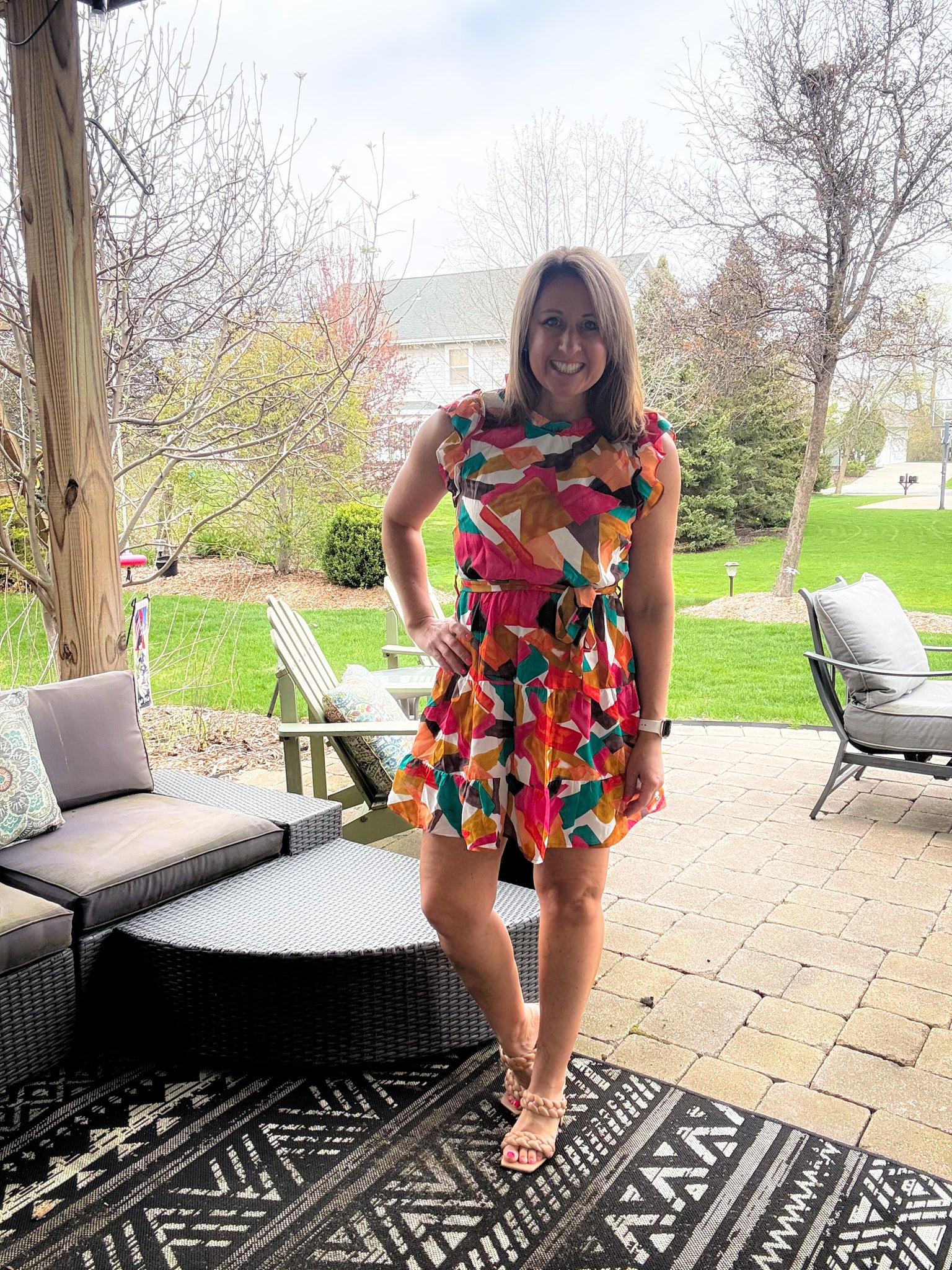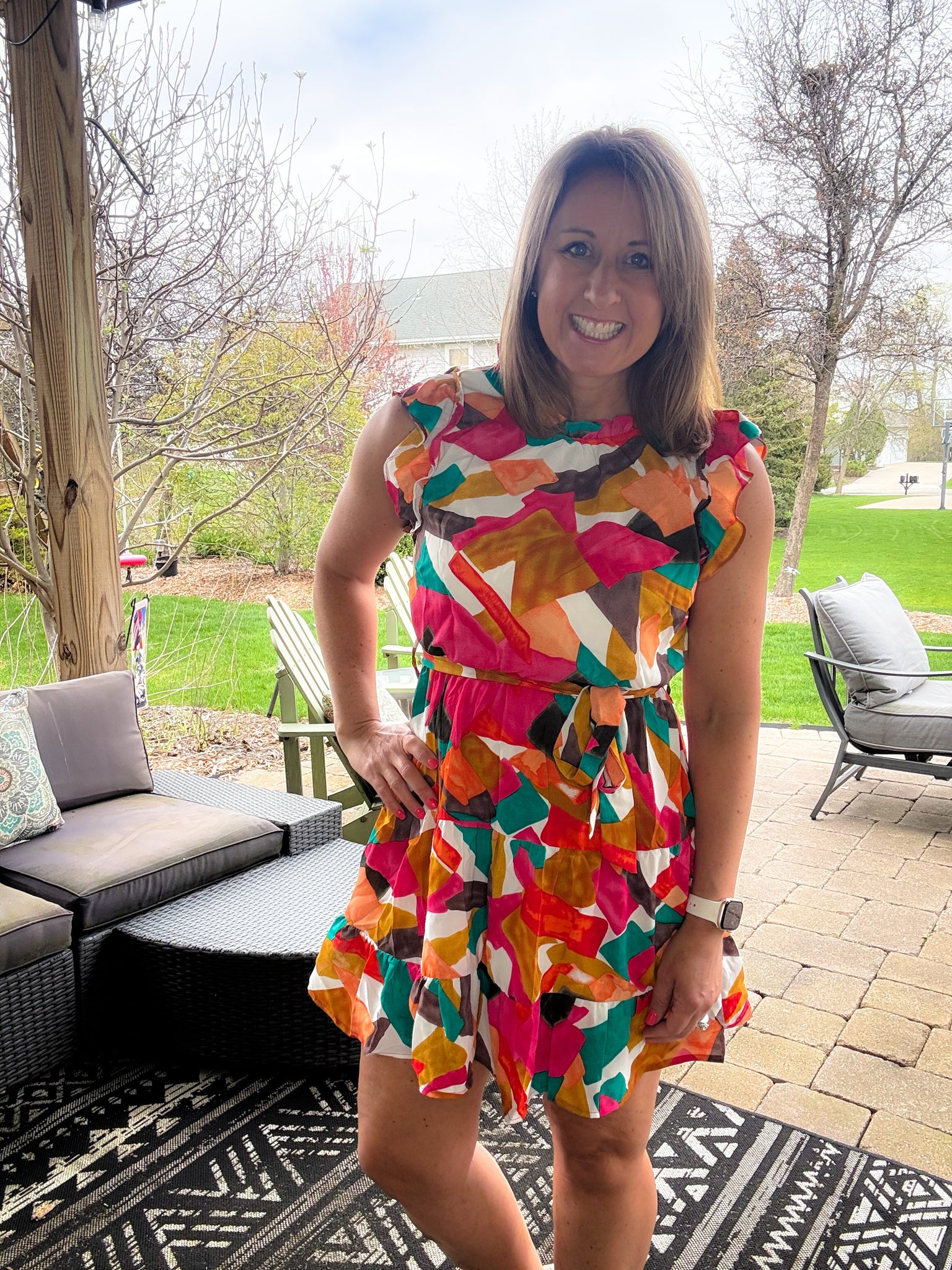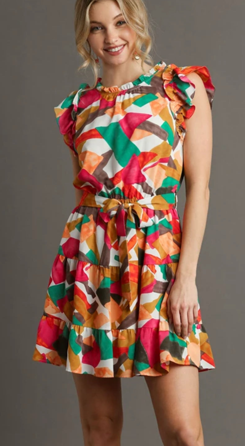 Abstract Print Round Neck Tiered Dress with Ruffle Sleeves, Ruffle Trim Neckline & Waist Tie Detail Along with Back Button Keyhole. Lined.