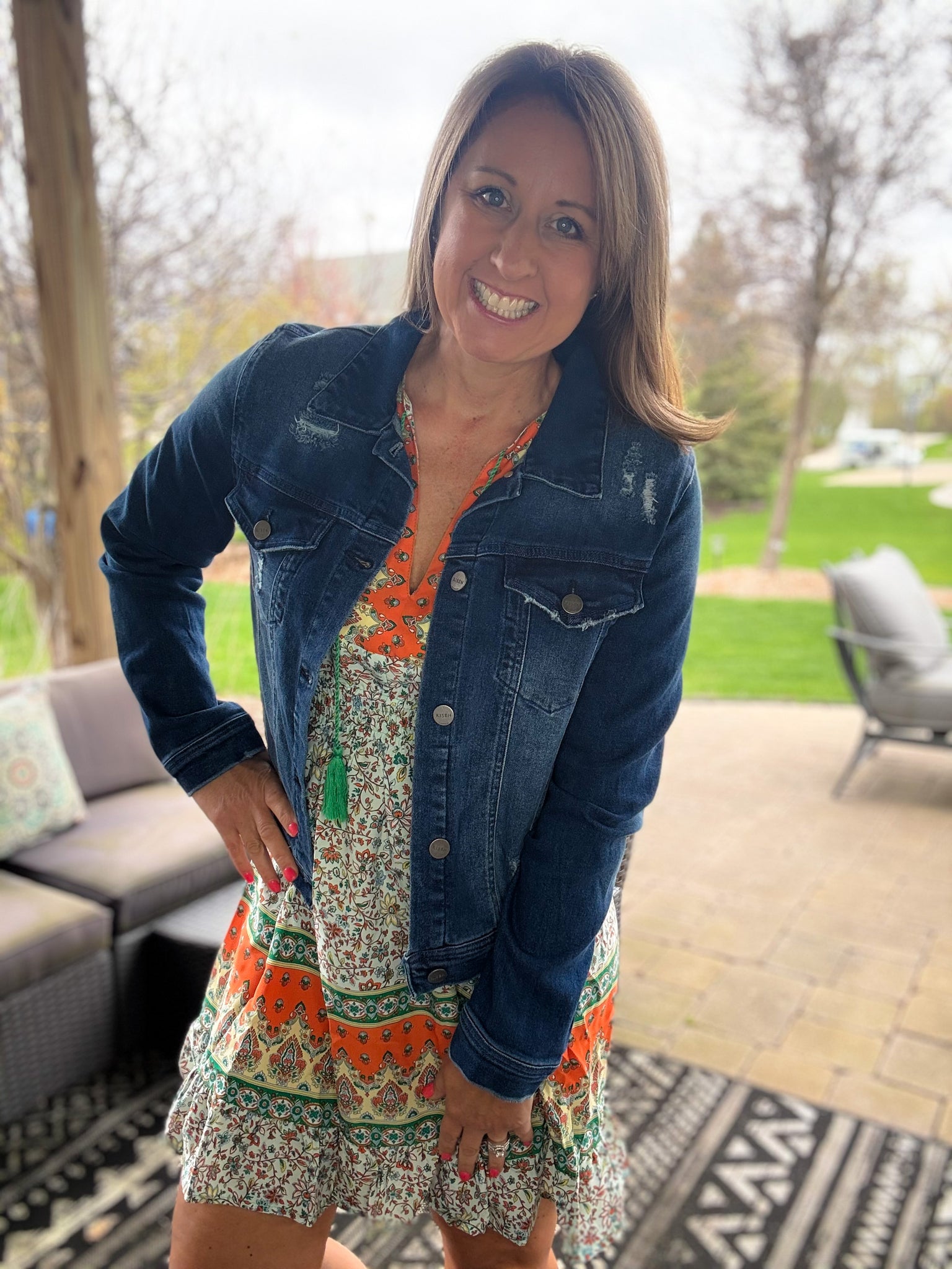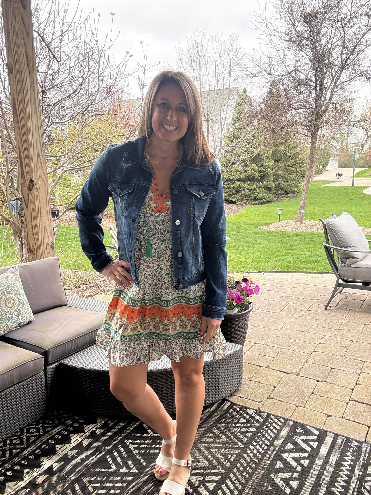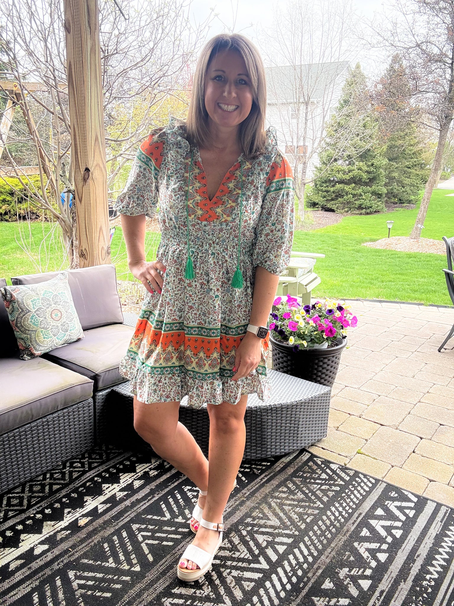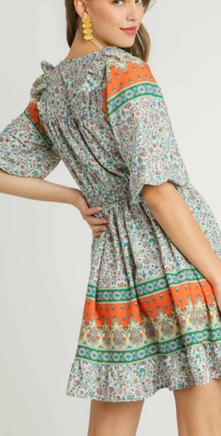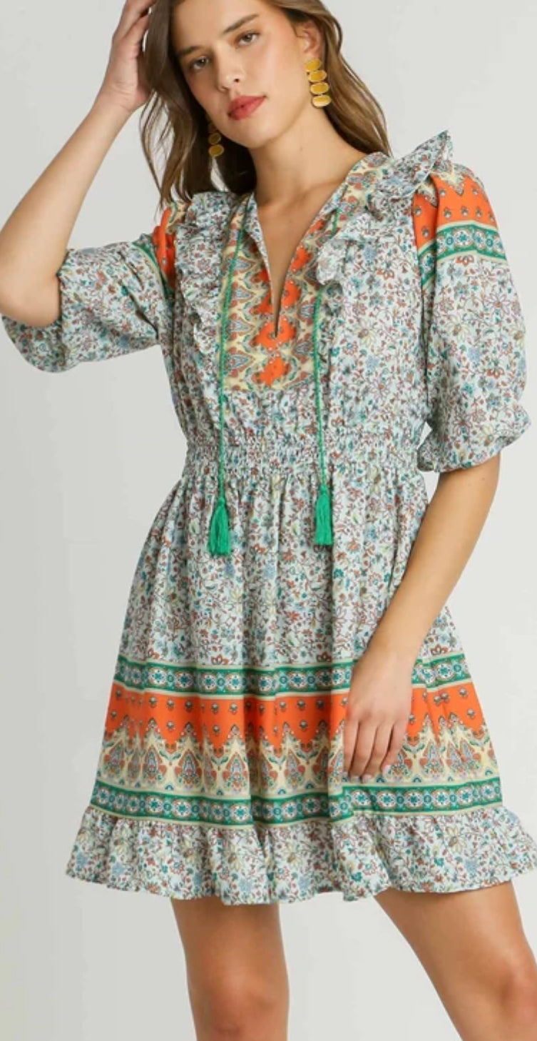 V-Neck Border Print Dress with Elastic Waist, Tassel Front Tie, & Short Balloon Sleeves. Not lined.