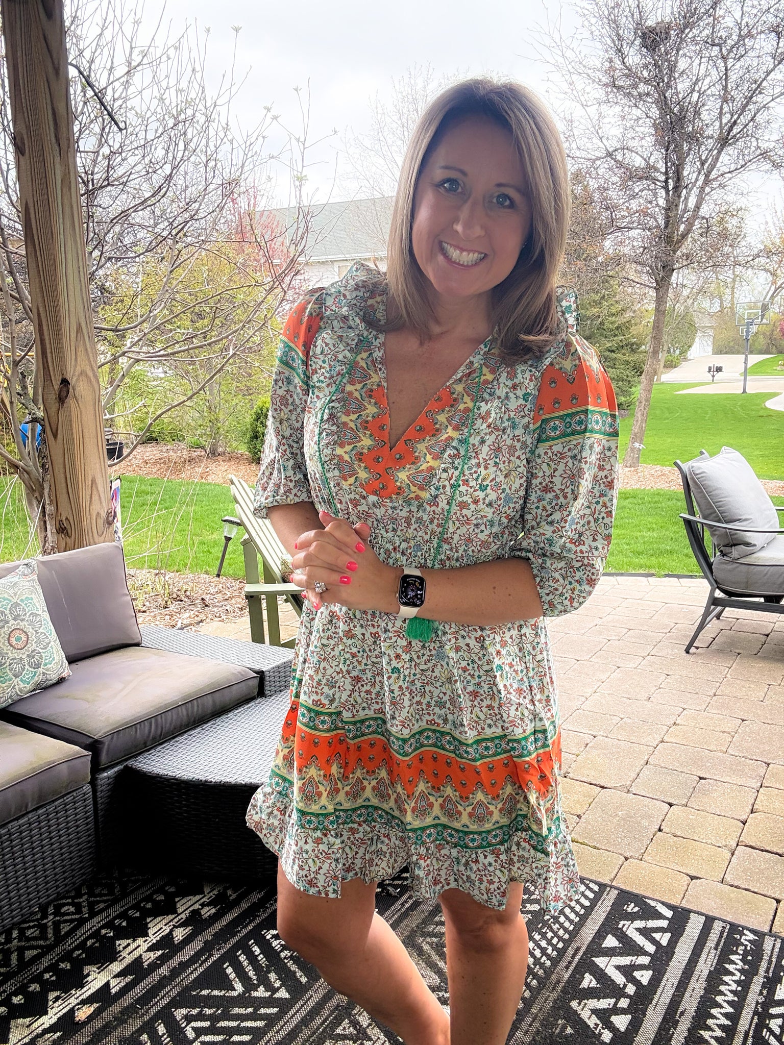 V-Neck Border Print Dress with Elastic Waist, Tassel Front Tie, & Short Balloon Sleeves. Not lined. 100% Polyester Read more
