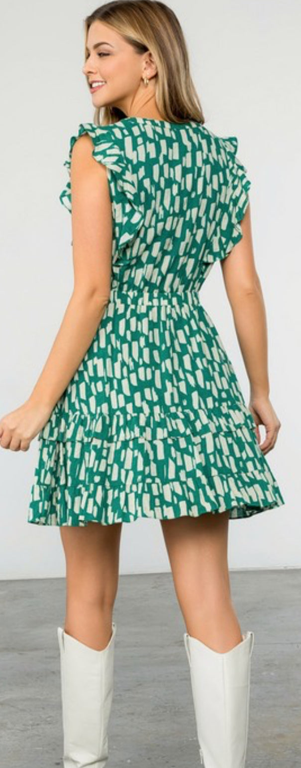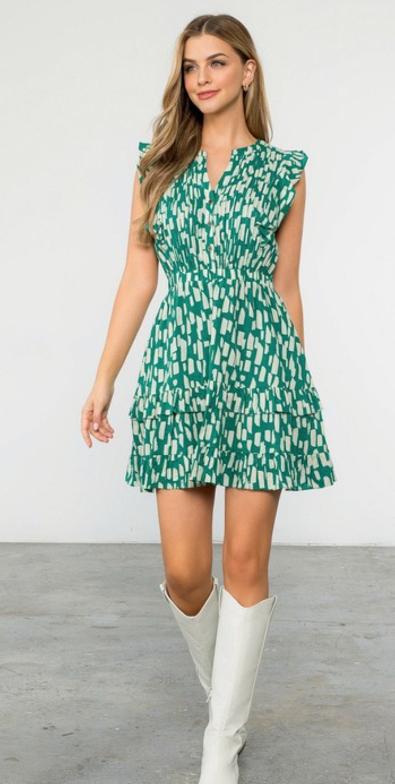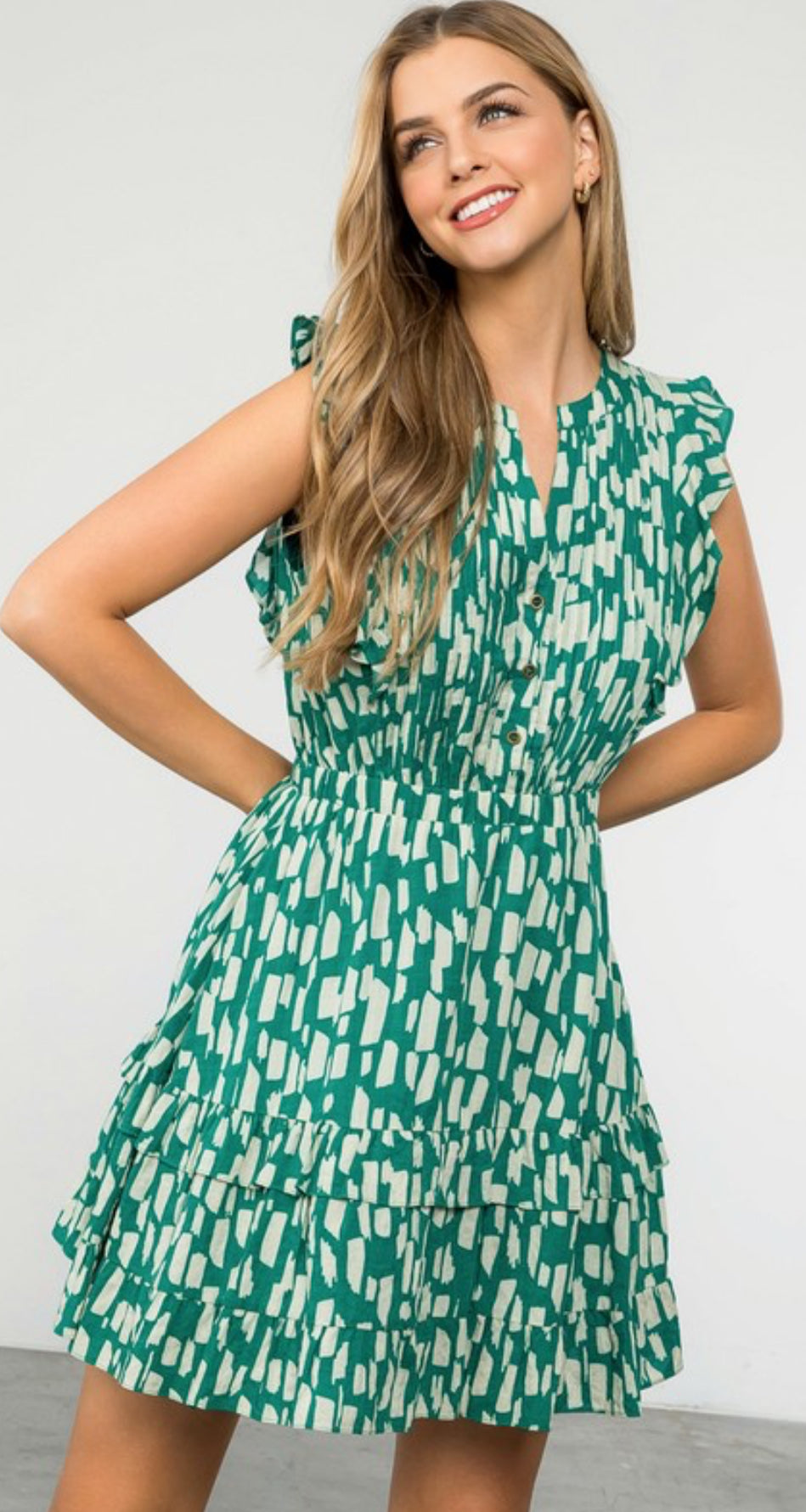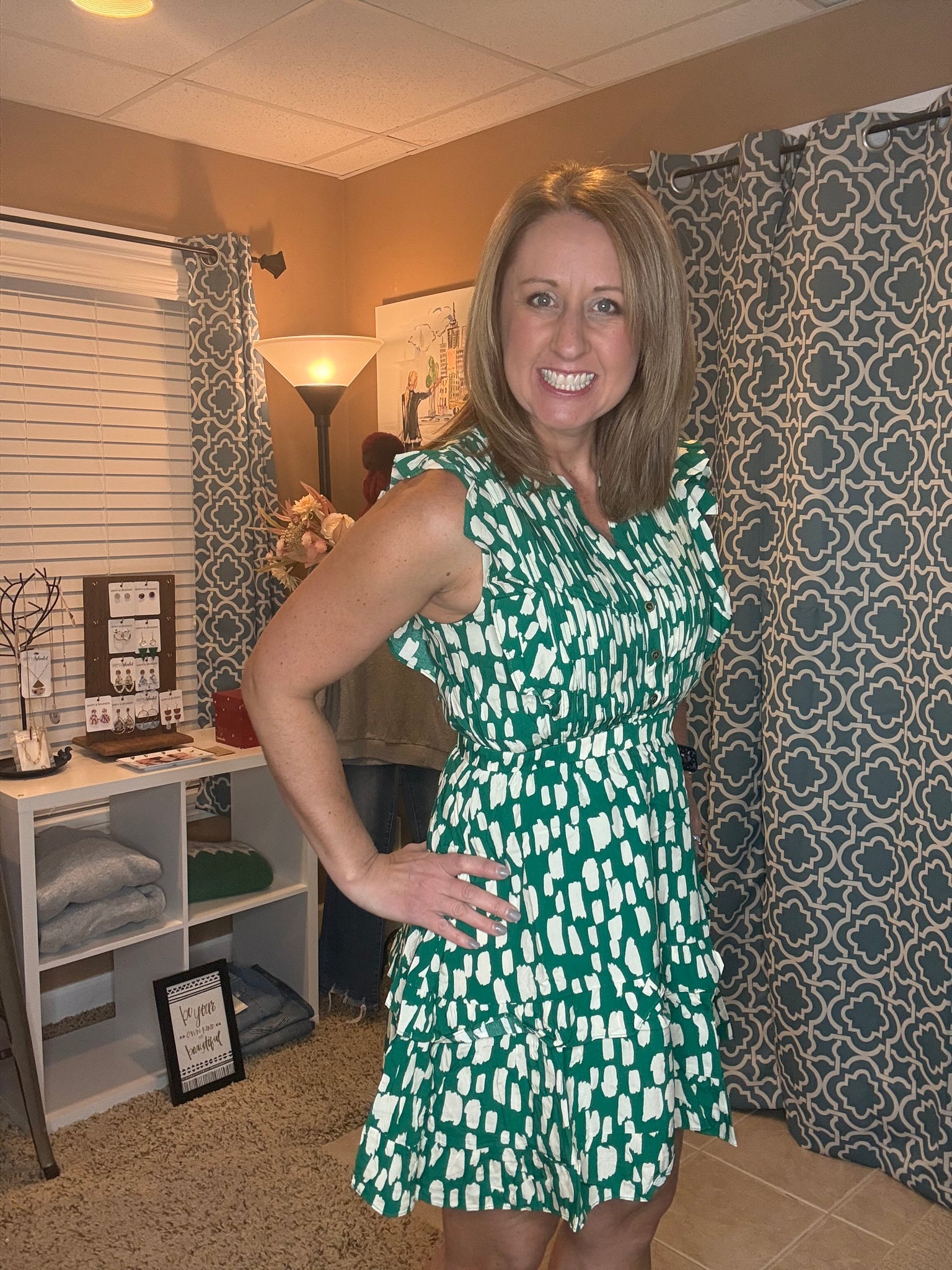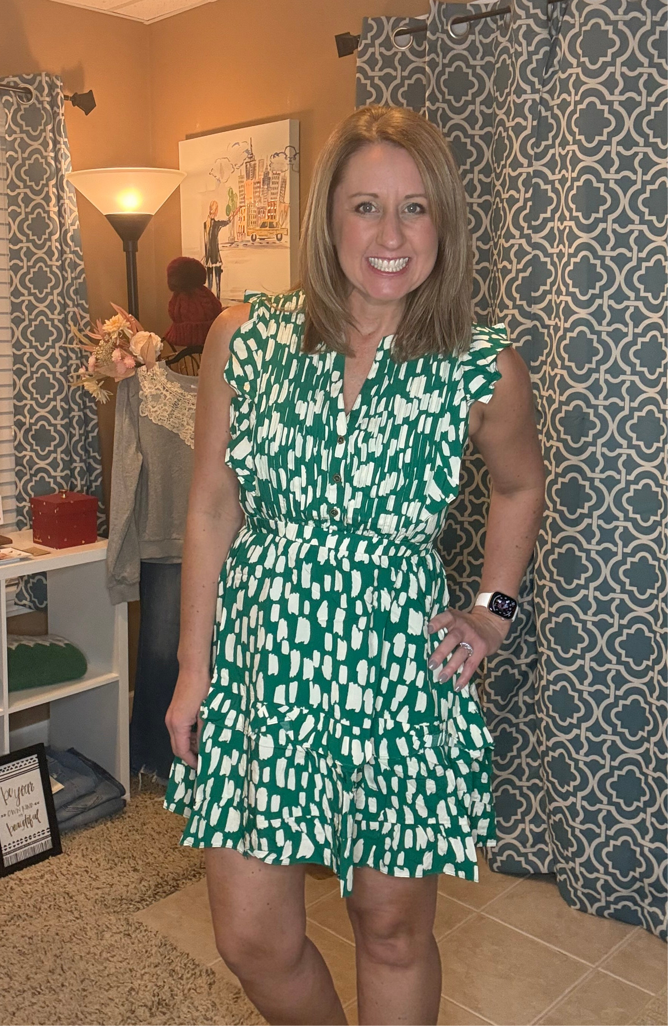Beautiful green print dress with functional button bodice, elastic waist, and feminine ruffle sleeves. Truly a stunning dress!