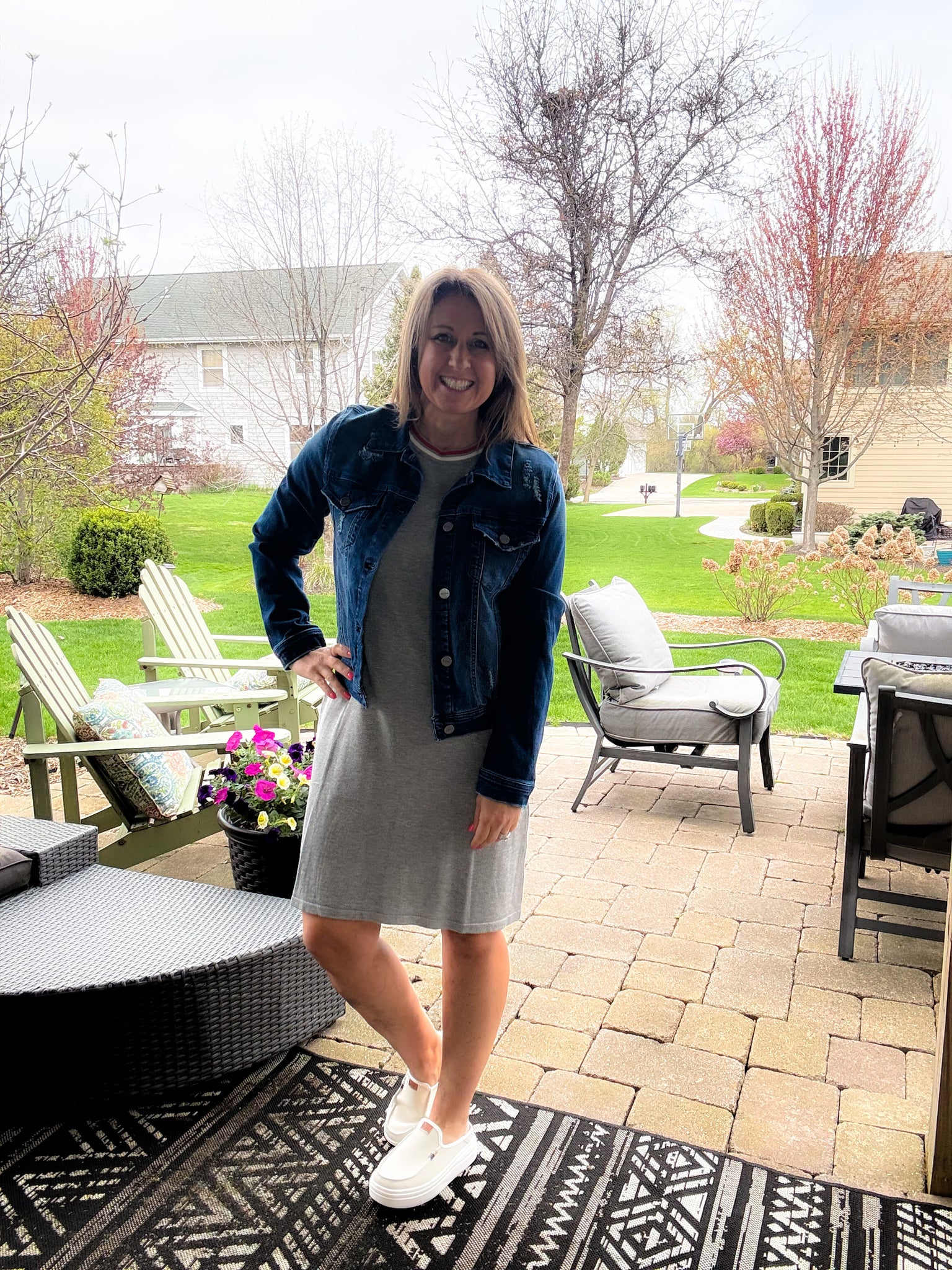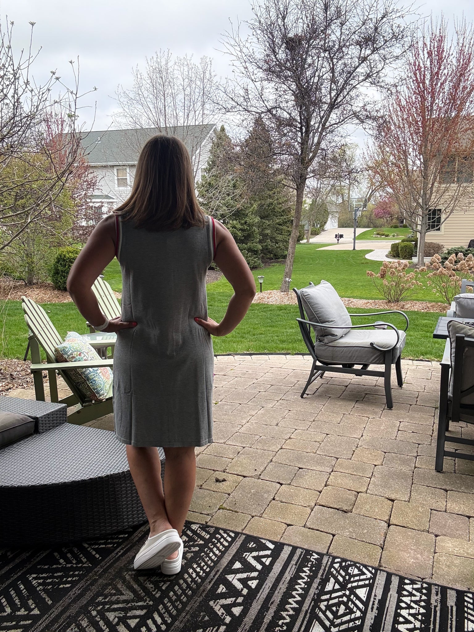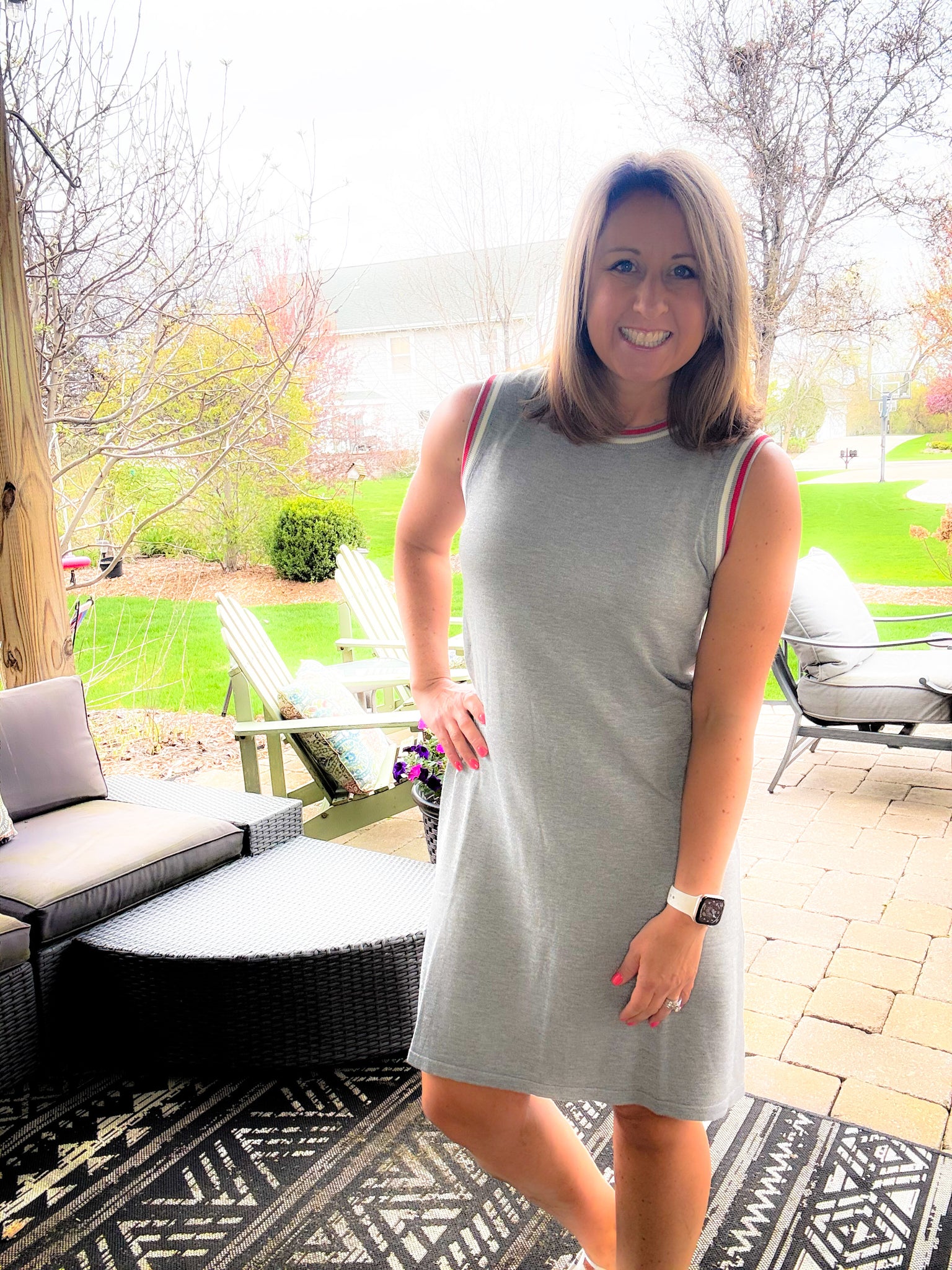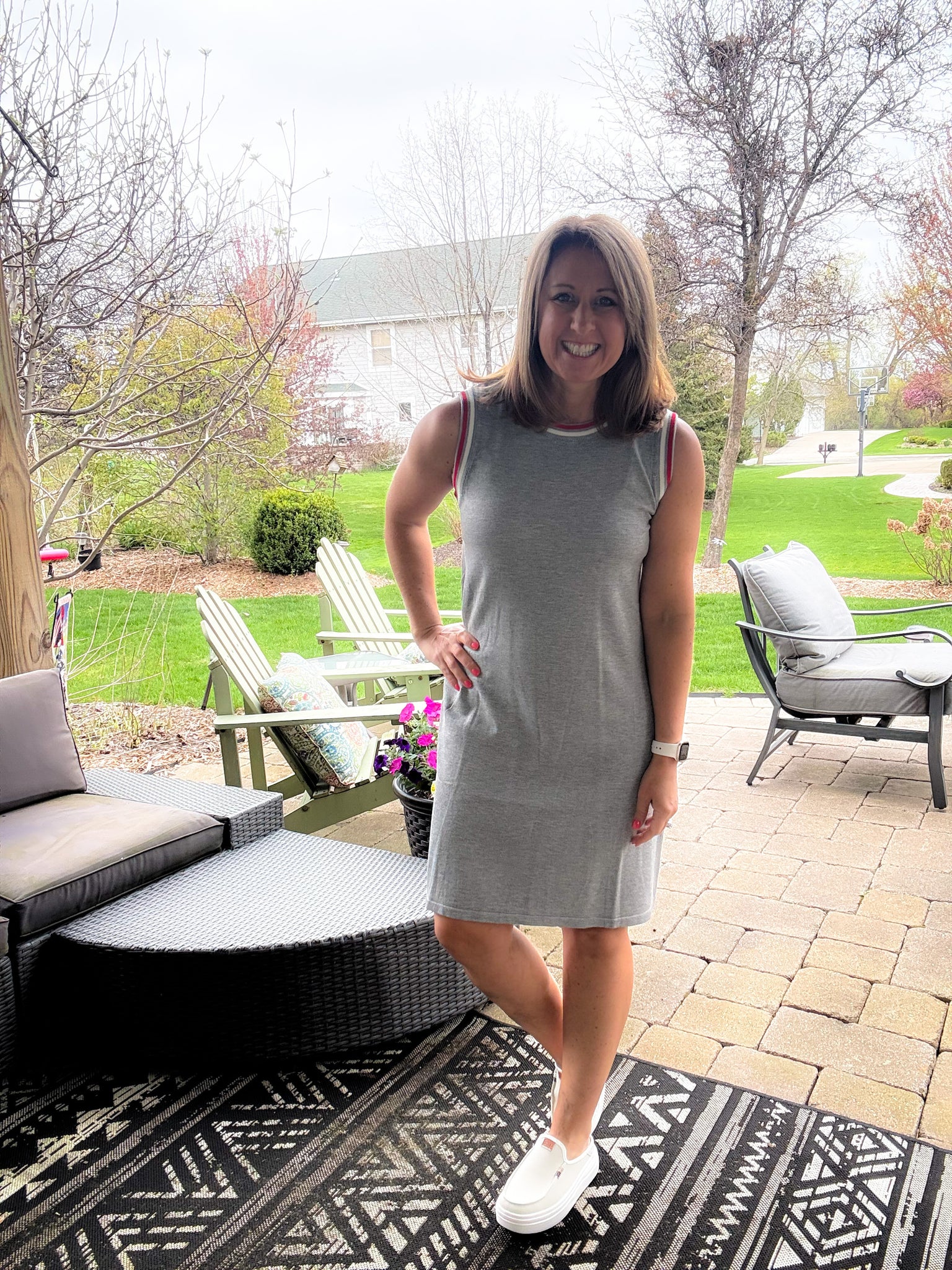 Grey tank dress with contrasting stripe detail. 100% Viscose so comfy and cute!
