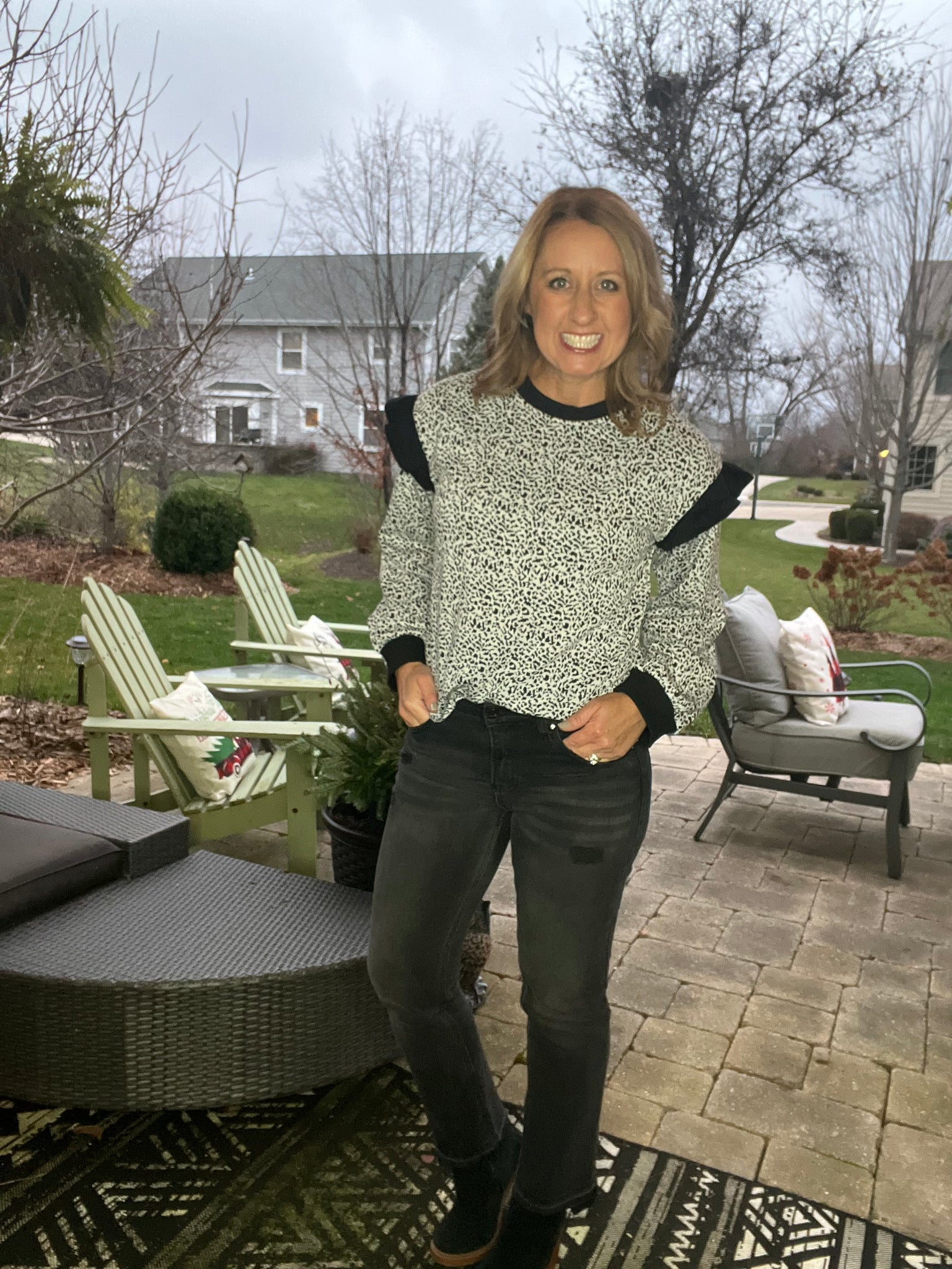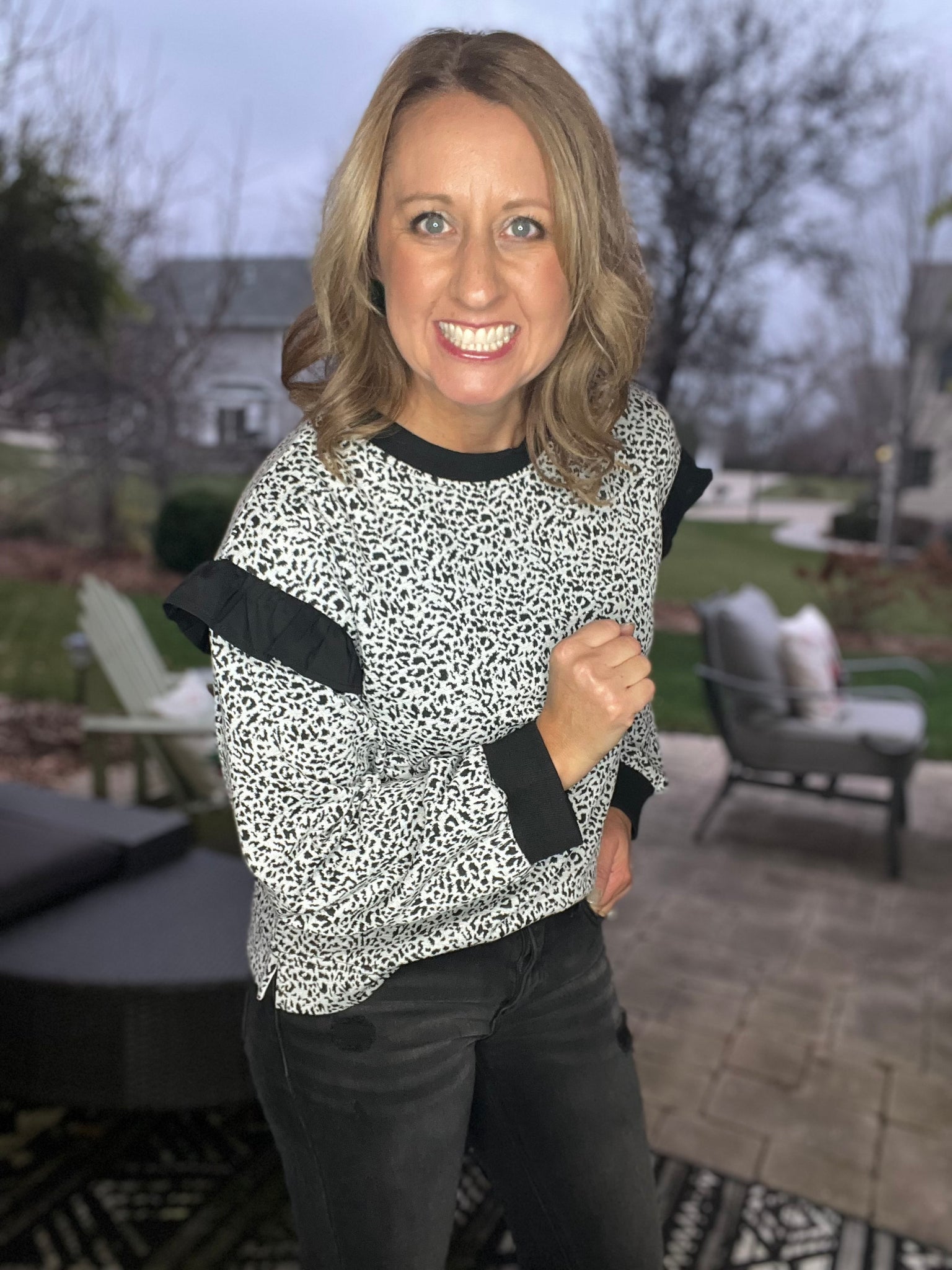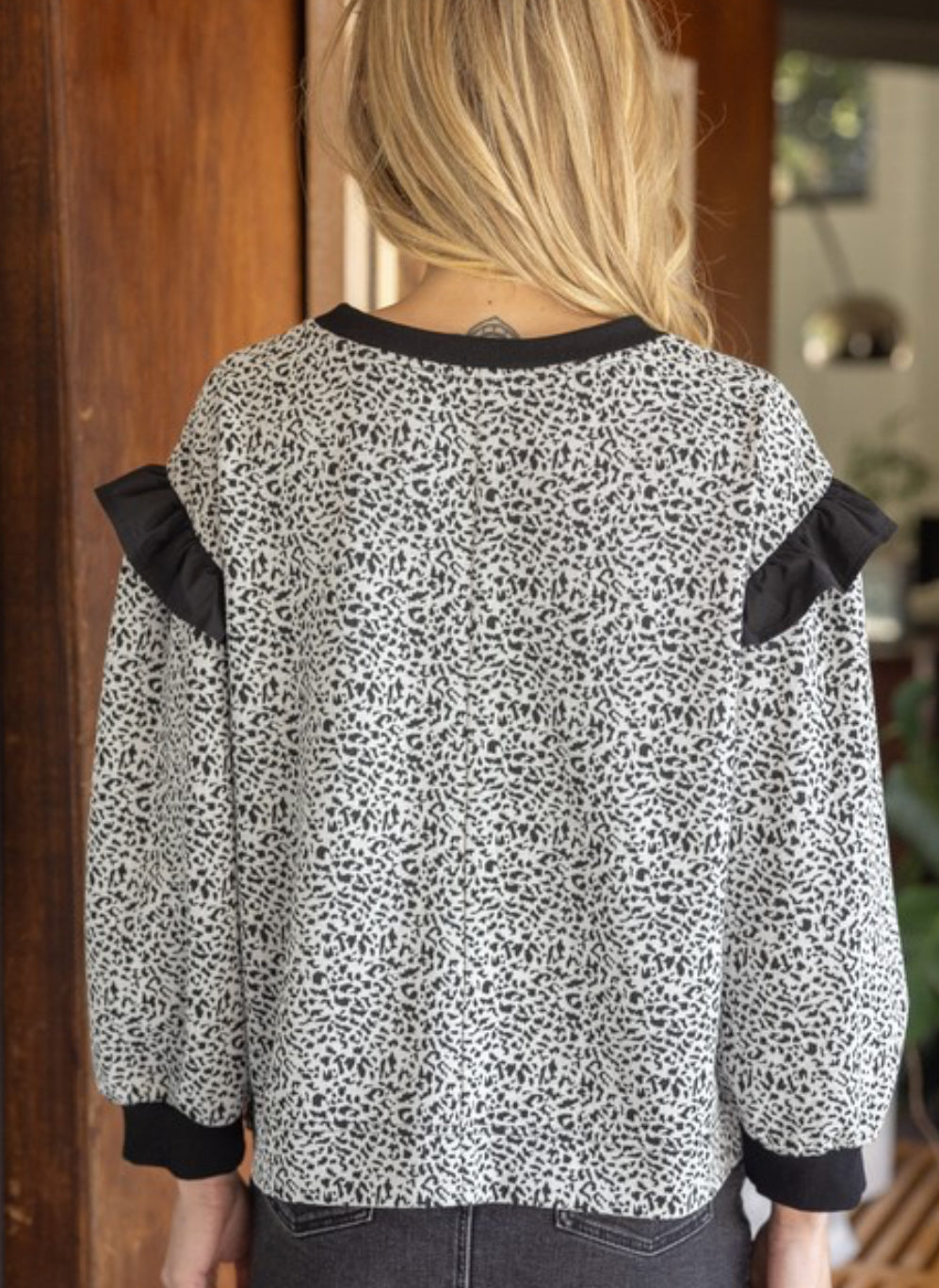 Leopard knit with adorable ruffle detailed sleeves. Dress up or down! A fabulous piece!