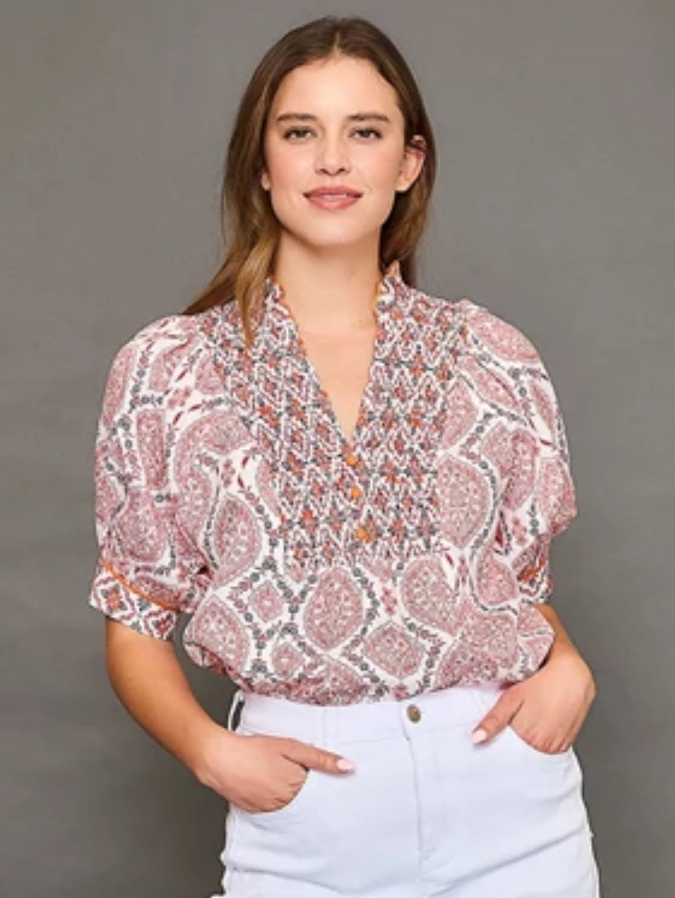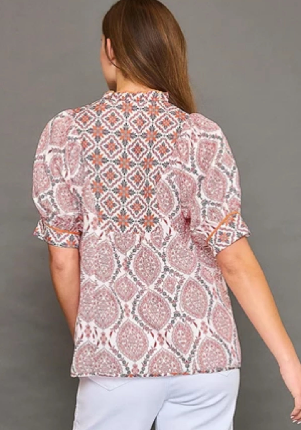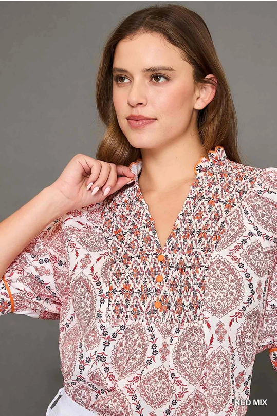 Red mix print boho blouse. Relaxed, flowy fit. Short sleeves with subtle puff detailing.