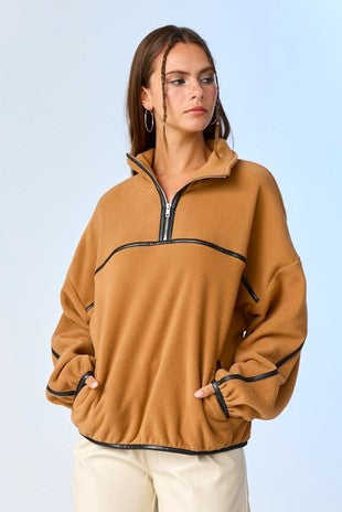 Slightly oversized mocha half zip with contrasting black piping. Front pocket.