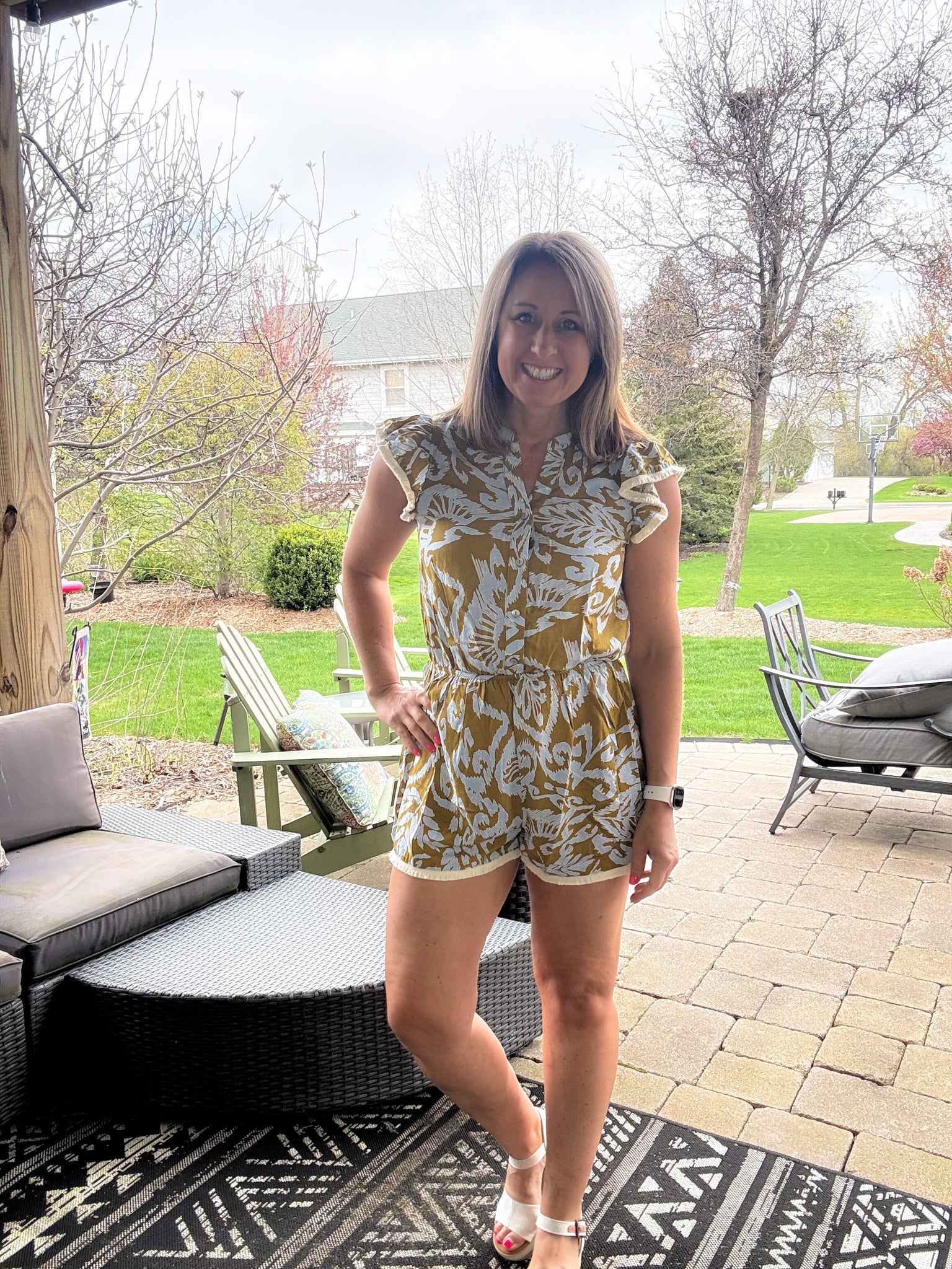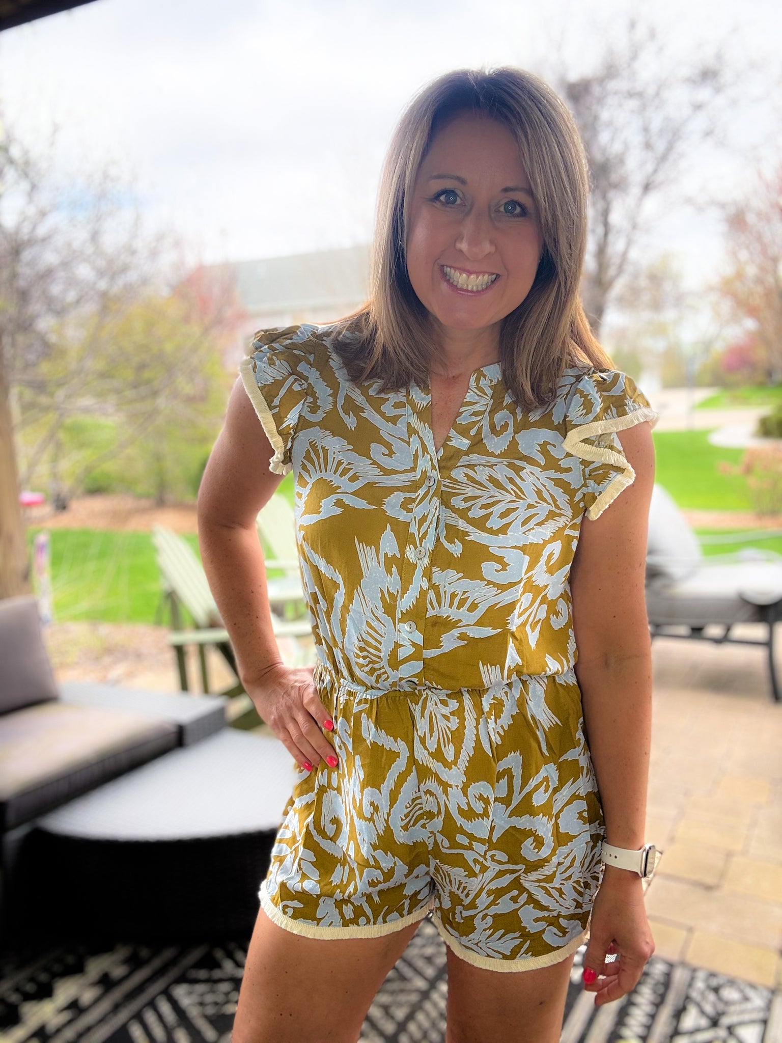 Fringe accented olive print romper. Vneck with button down detail. Fringe accent around sleeved and bottom hem.