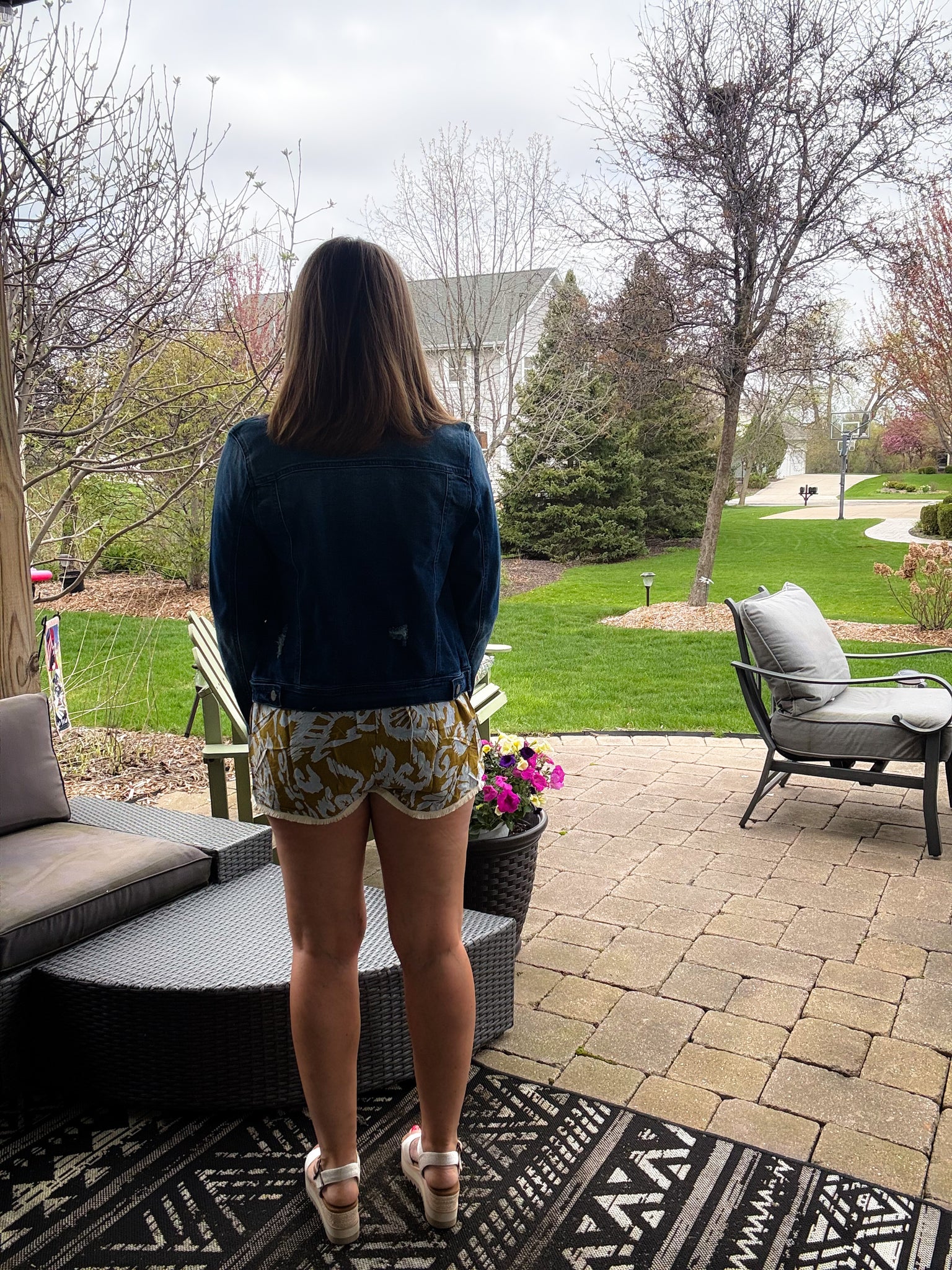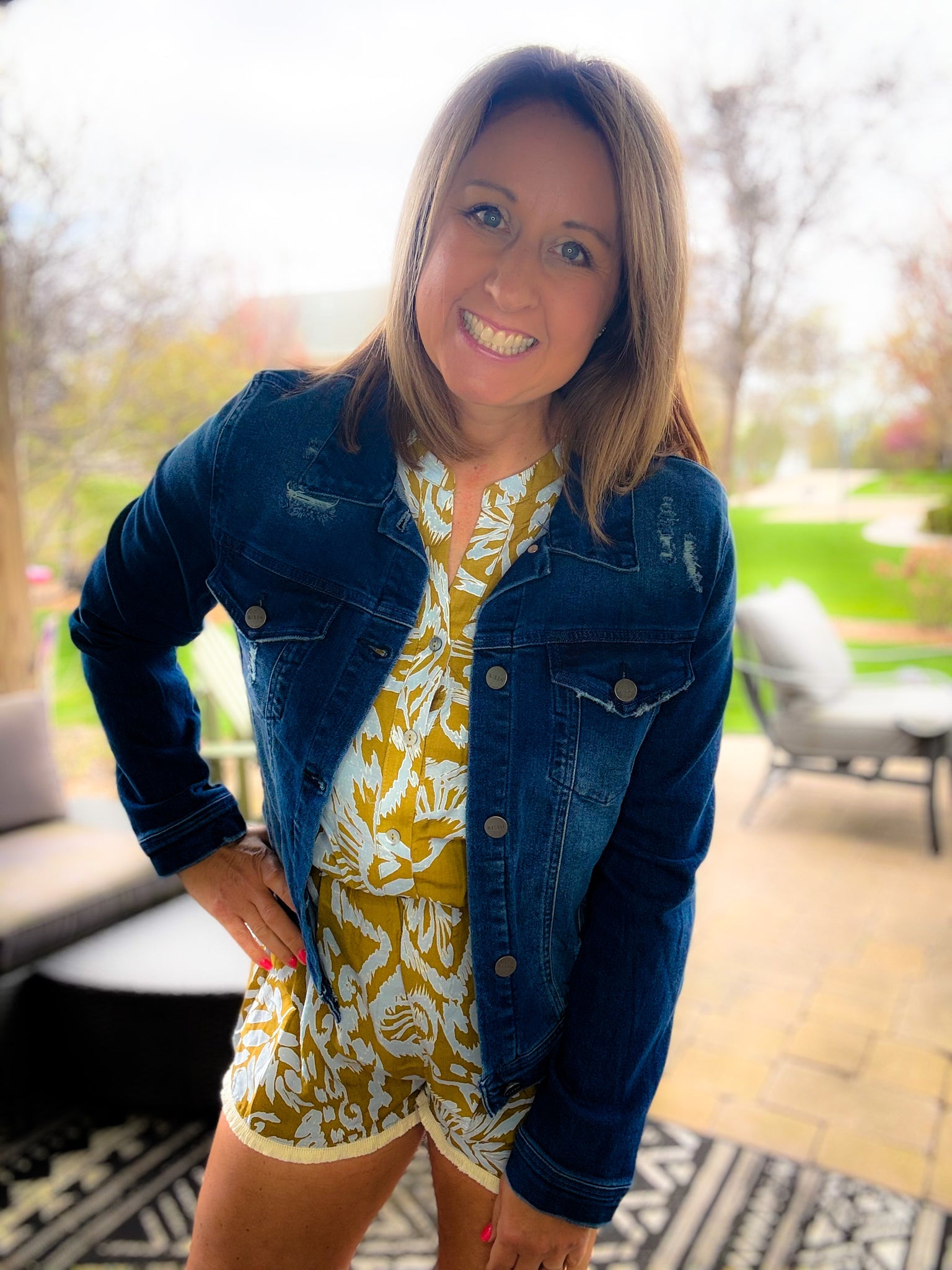 Fringe accented olive print romper. Vneck with button down detail. Fringe accent around sleeved and bottom hem. Read more