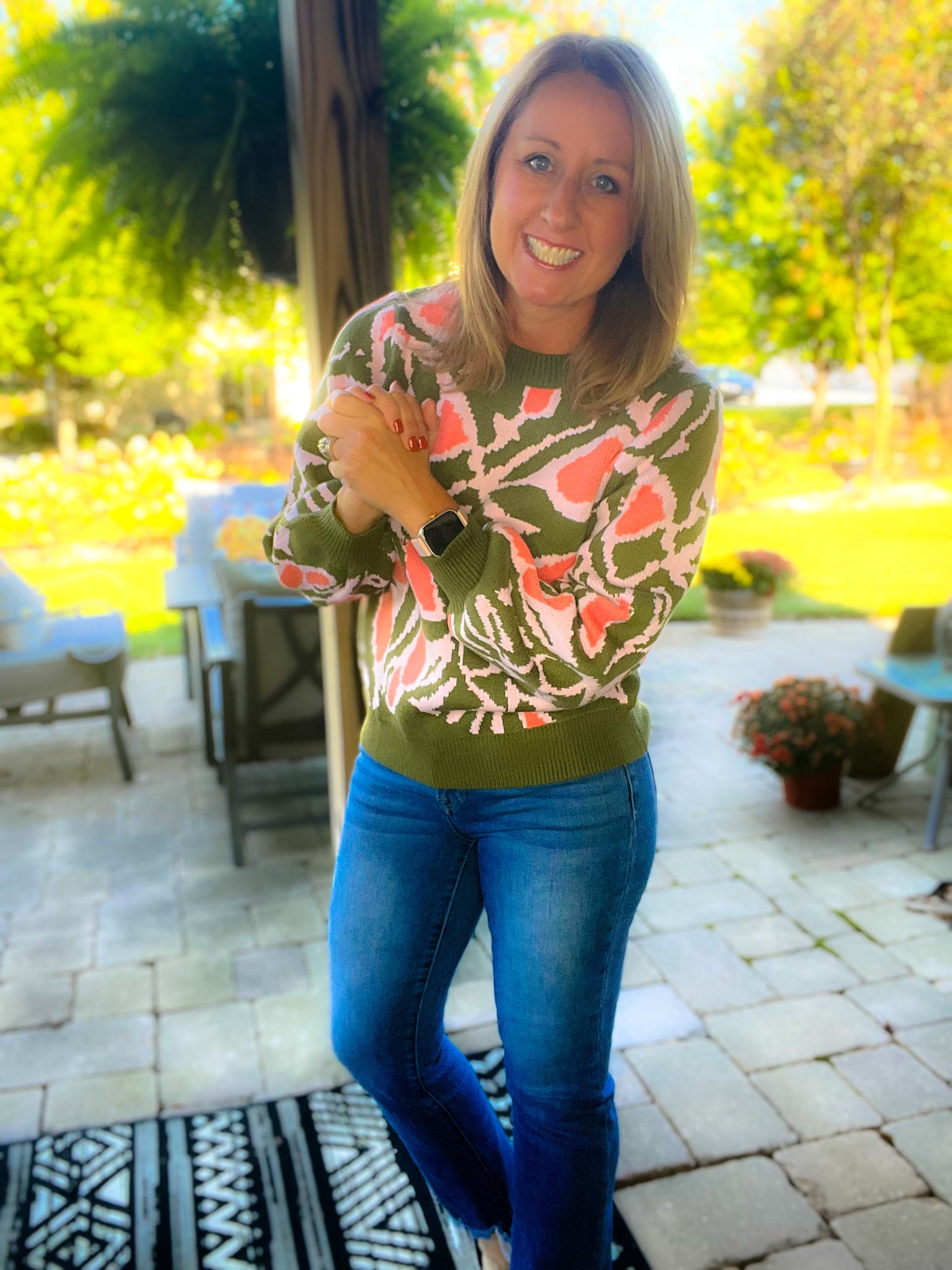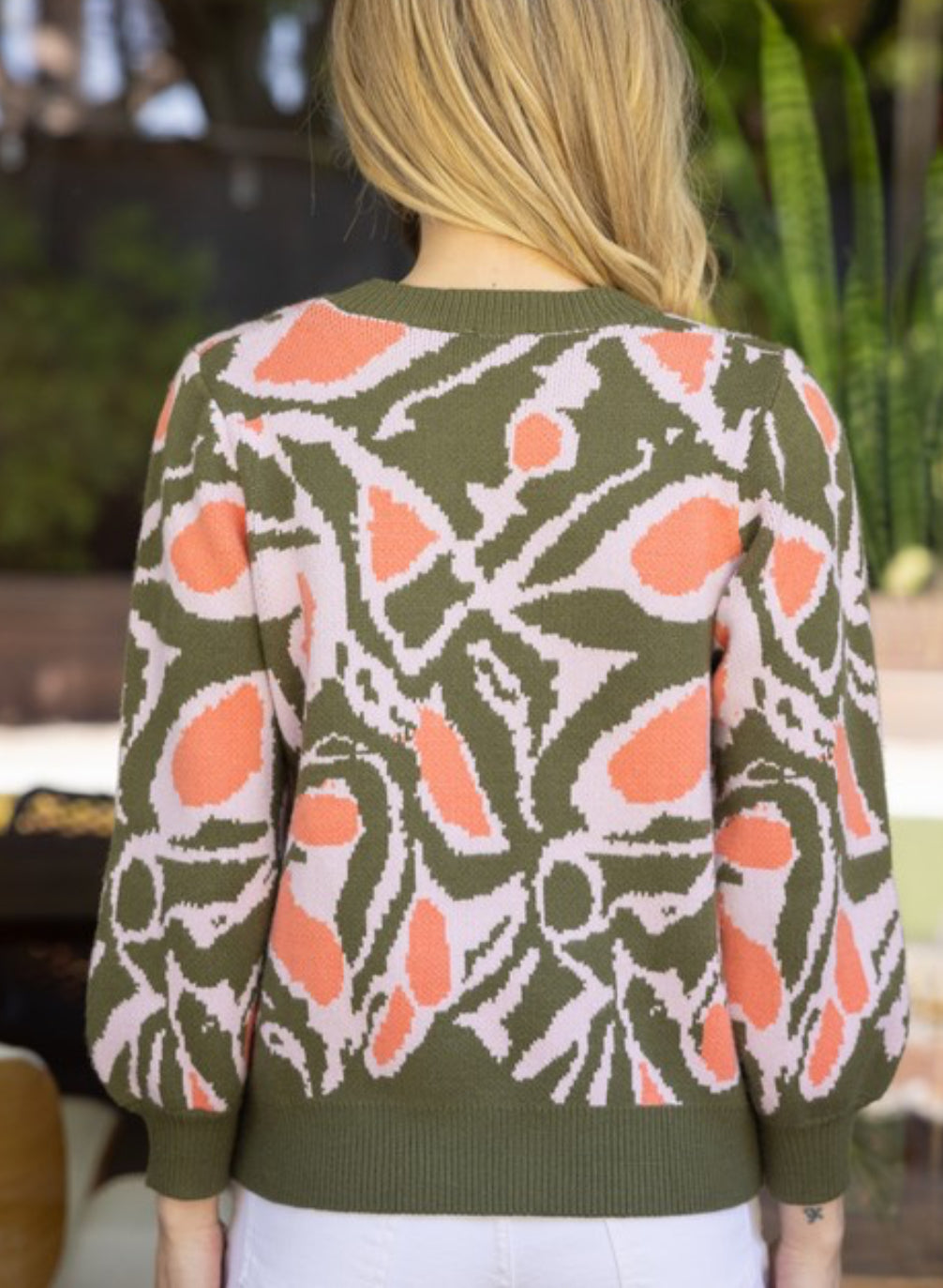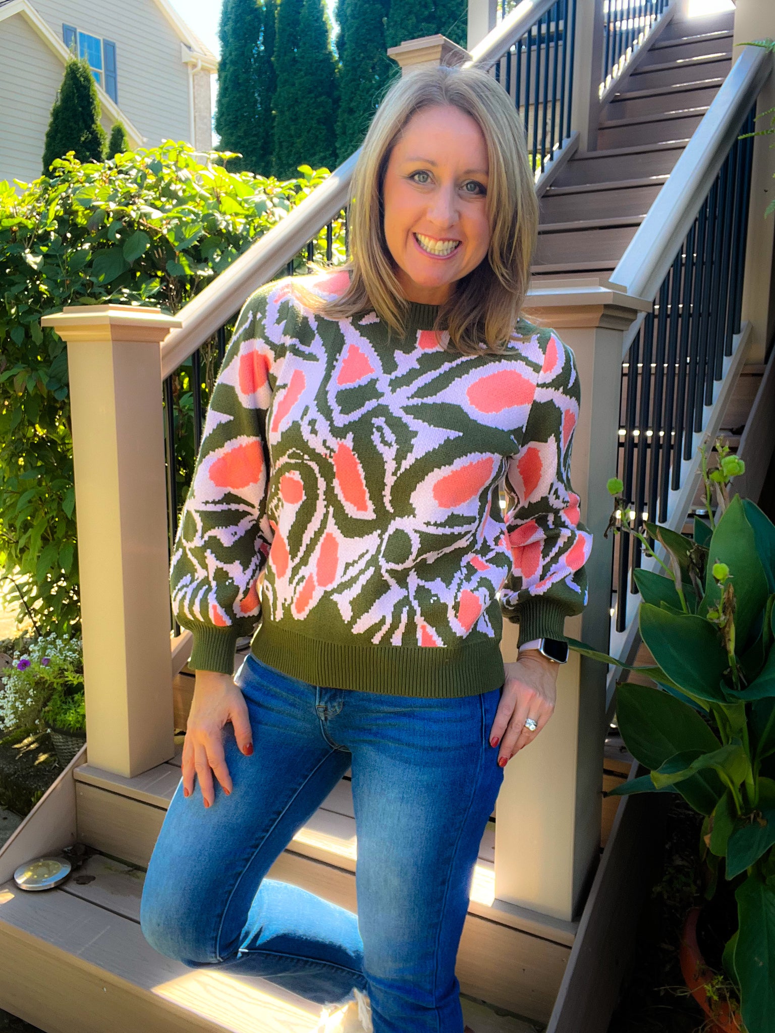 Round neckline sweater in olive with lavender and coral floral print. Read more