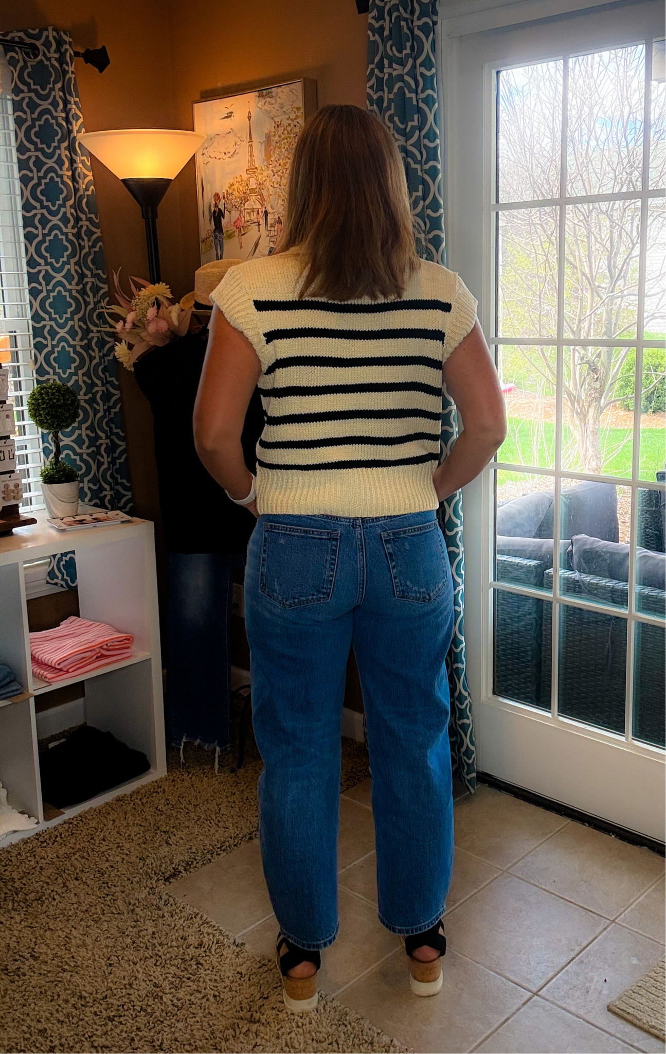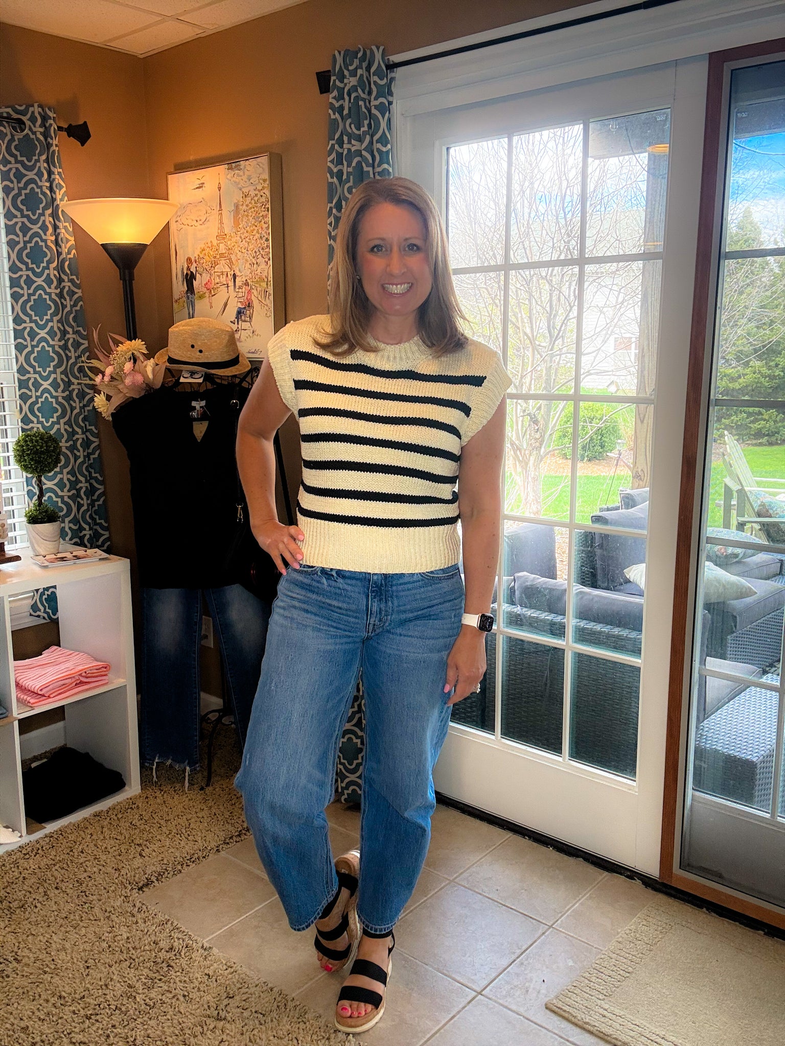 Black and natural striped knit top.