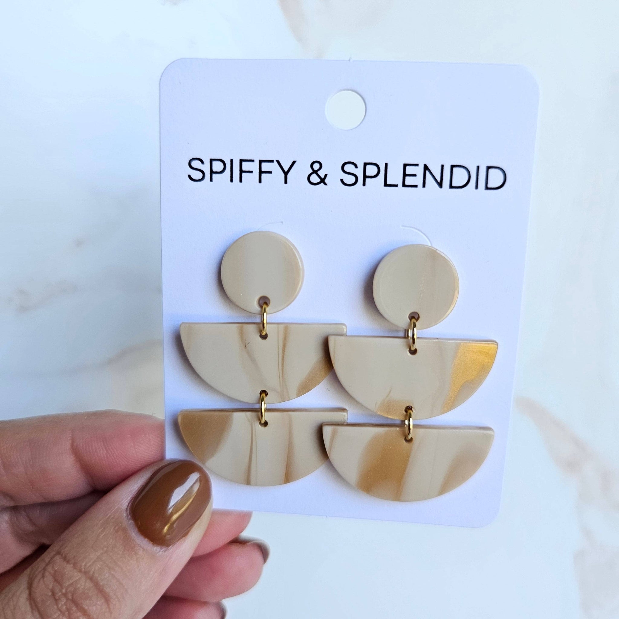 Introducing Elsie – a chic and sassy addition to any ensemble! These golden ivory acrylic earrings make a bold statement with their monochromatic design and semi-circle drops. Look stylish and on-trend with a pair of these beauties.
