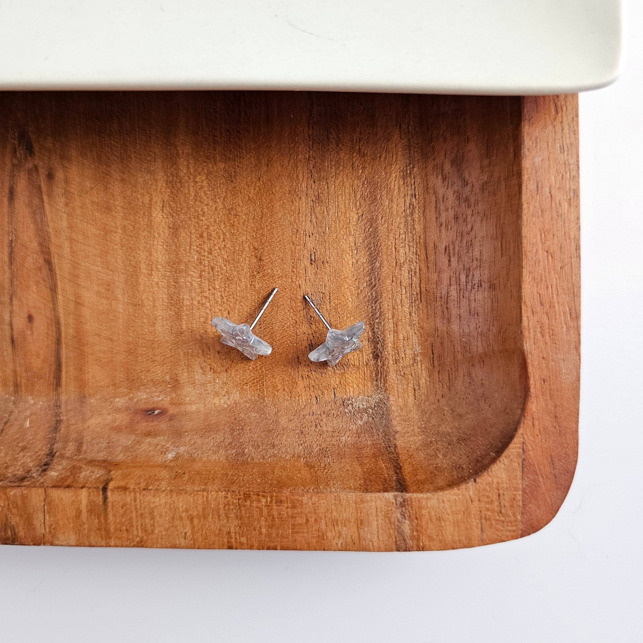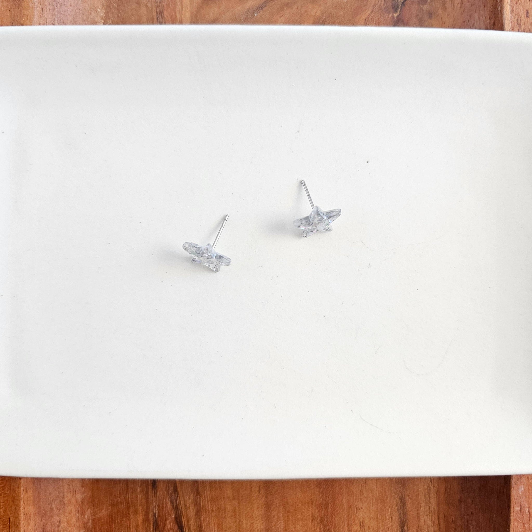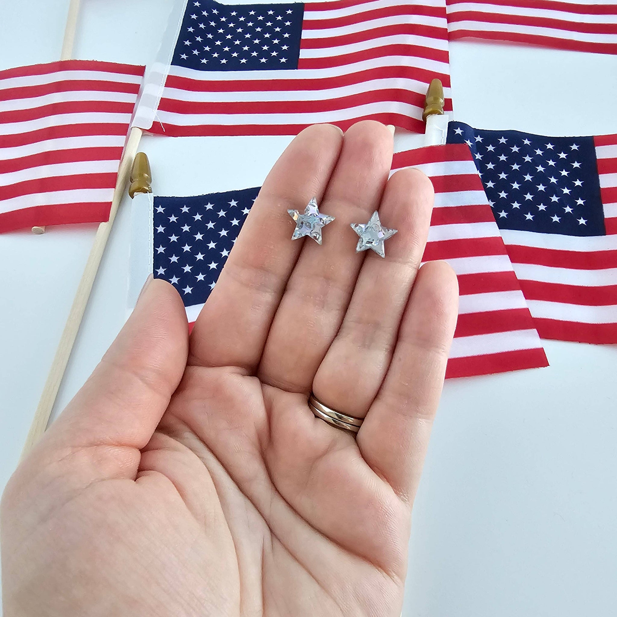 Our Star Studs are our classic dainty star-shaped stud earrings featuring a silver glitter confetti that can be worn for patriotic festivities or all year long.