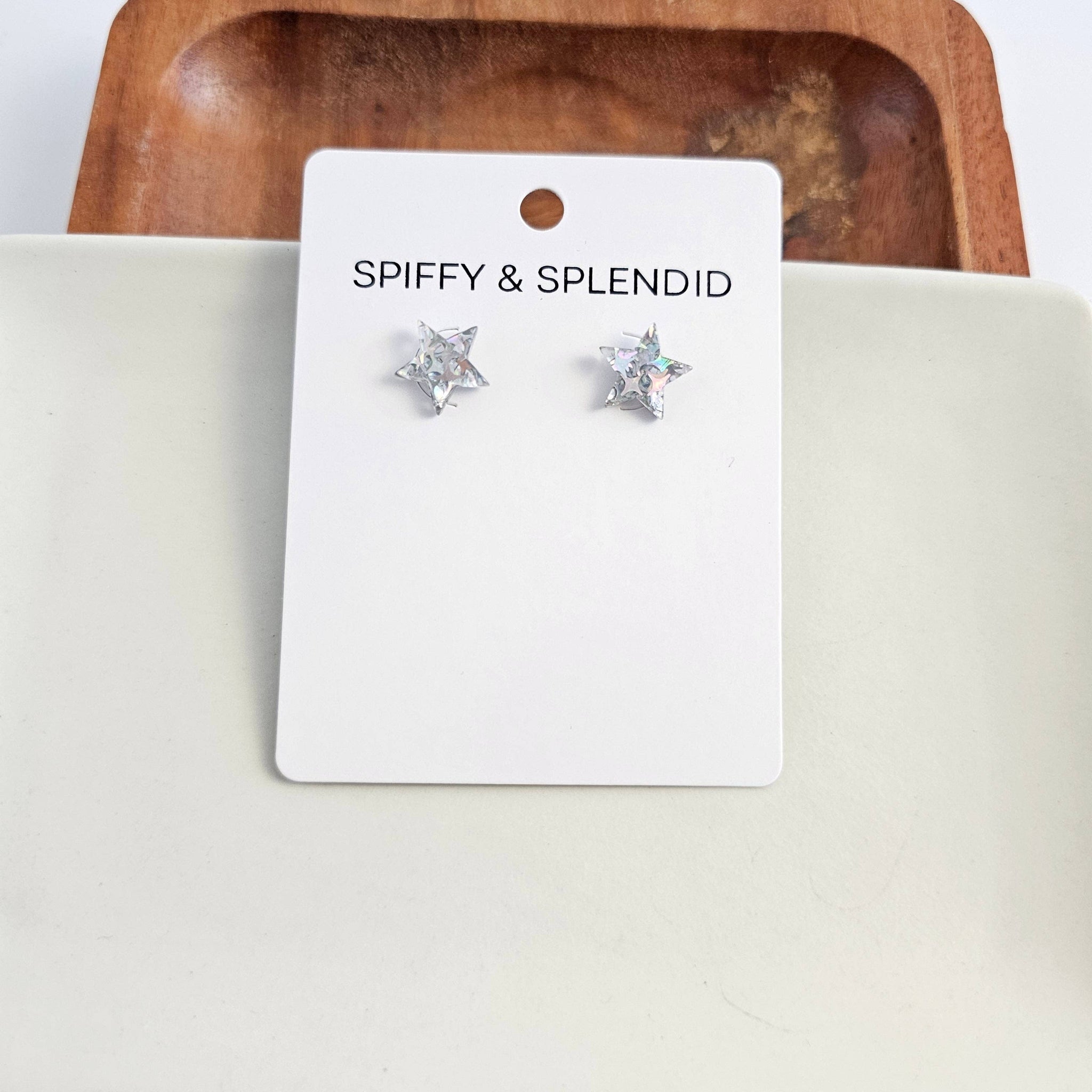 Our Star Studs are our classic dainty star-shaped stud earrings featuring a silver glitter confetti that can be worn for patriotic festivities or all year long. * Hypoallergenic stainless steel posts * Durable and lightweight acrylic * 12mm...Read more
