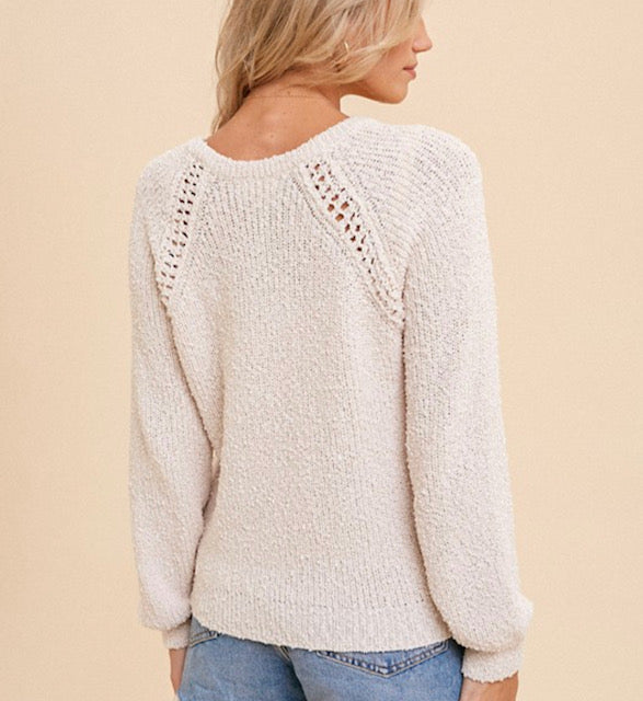 Crochet detail textured v neck sweater. Perfect to pack on vacation or wear all through summer! Dress it up or wear casually. Soft and such a beautiful piece!