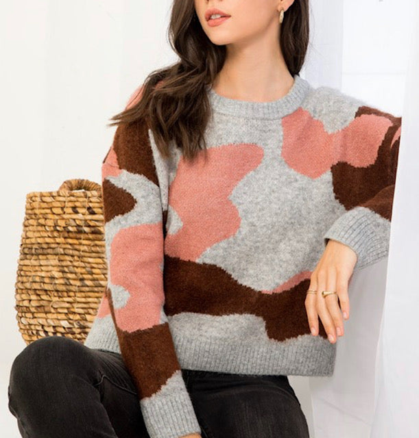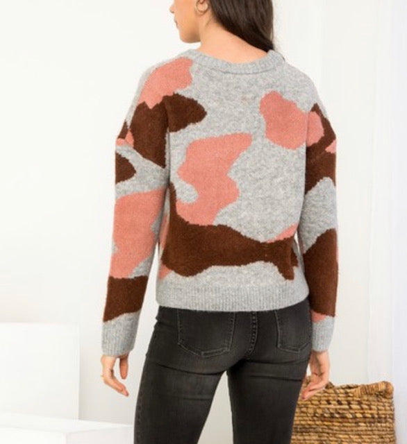 Camo Crewneck Sweater in Gray, Mauve and Brown. A great transition sweater. Not too thick and super comfortable! Runs TTS.