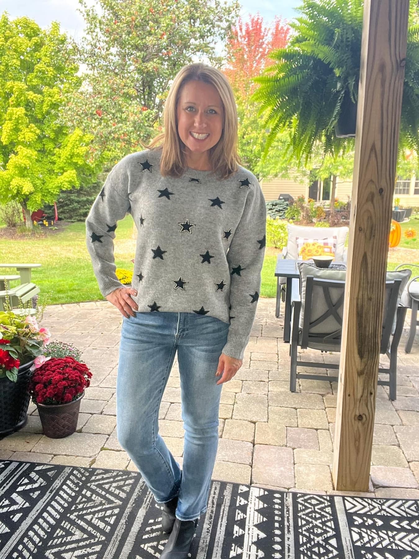 Grey sweater with black stars and outline detailing. Slightly oversized fit. A gorgeous piece perfect with denim or black pants! Very comfortable and not itchy at all.