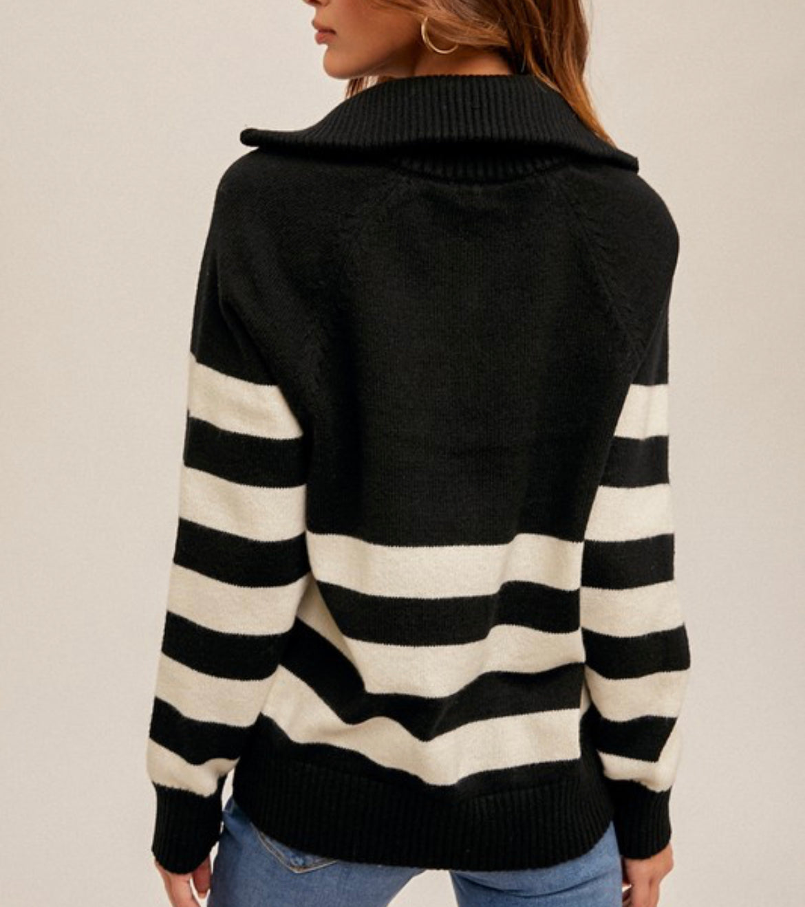 Zip up striped mix sweater in black and white with front pockets. Dress up or down. Comfortable and cute!