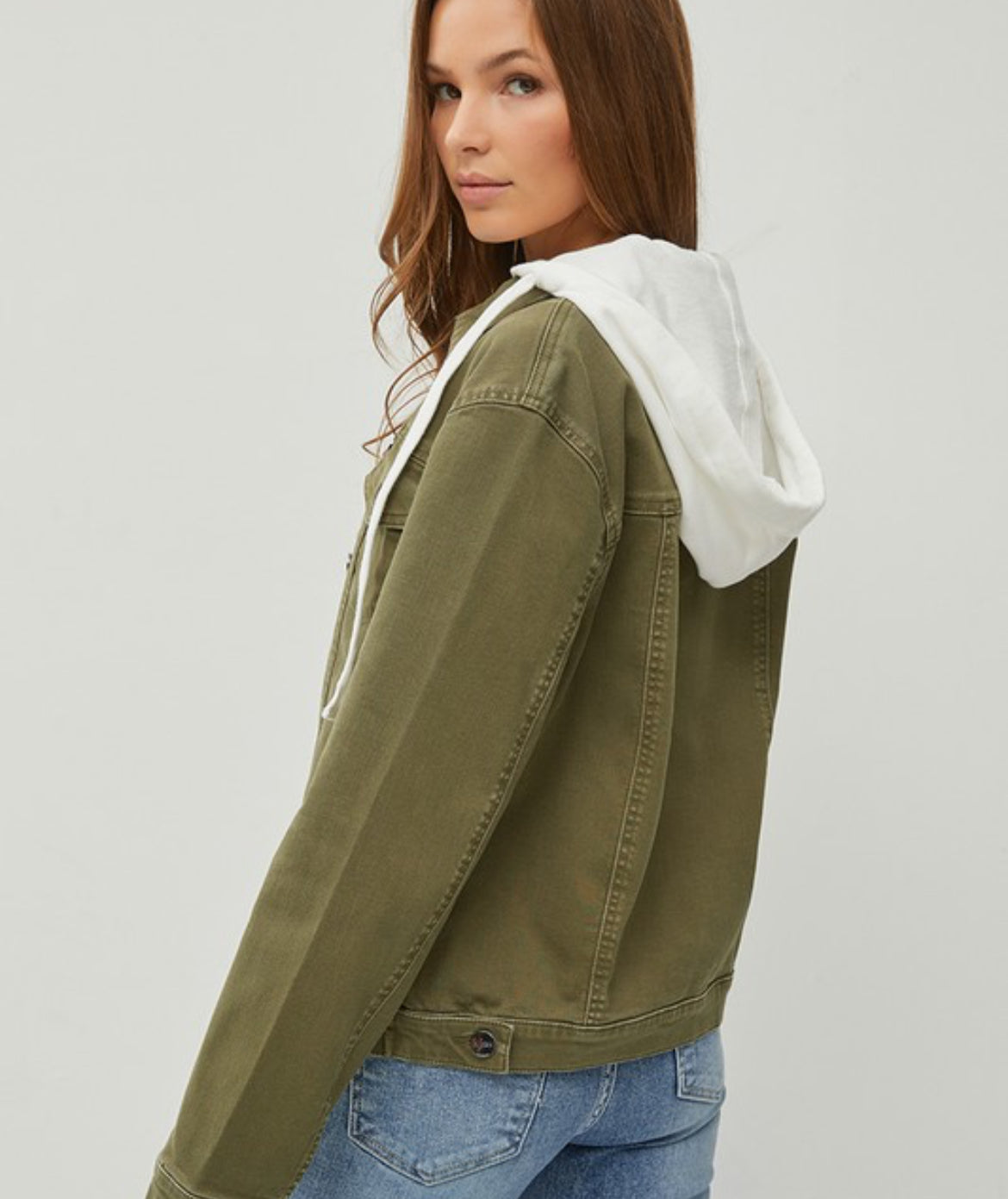 Slightly oversized olive jacket with removable hood! So many styling options!