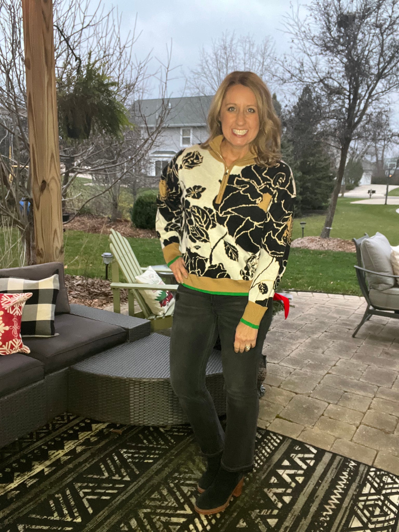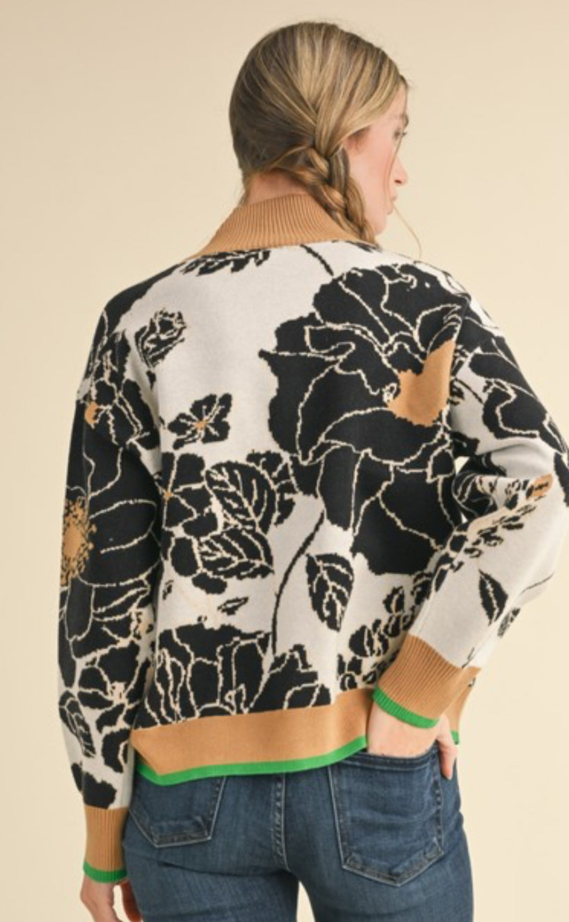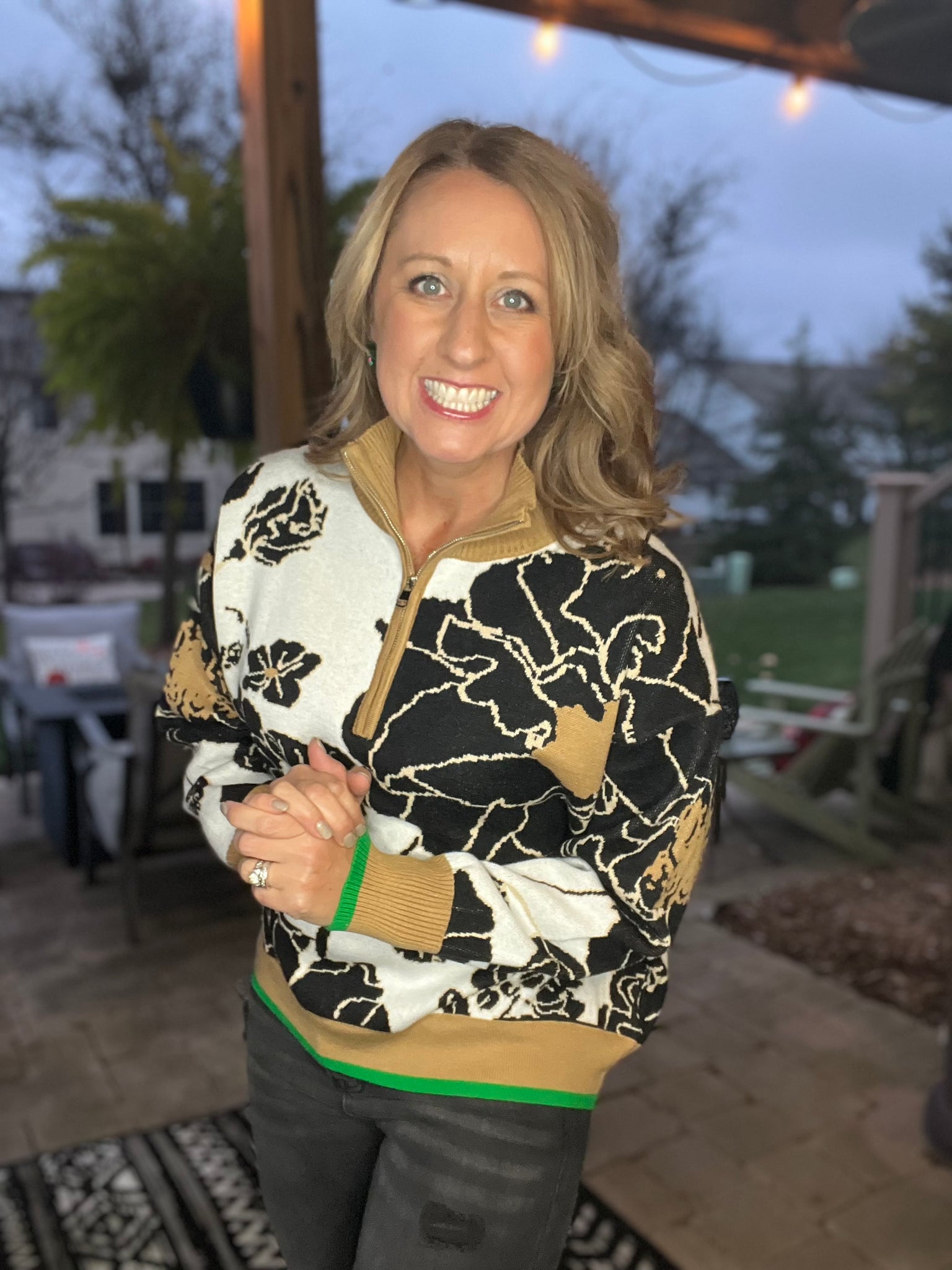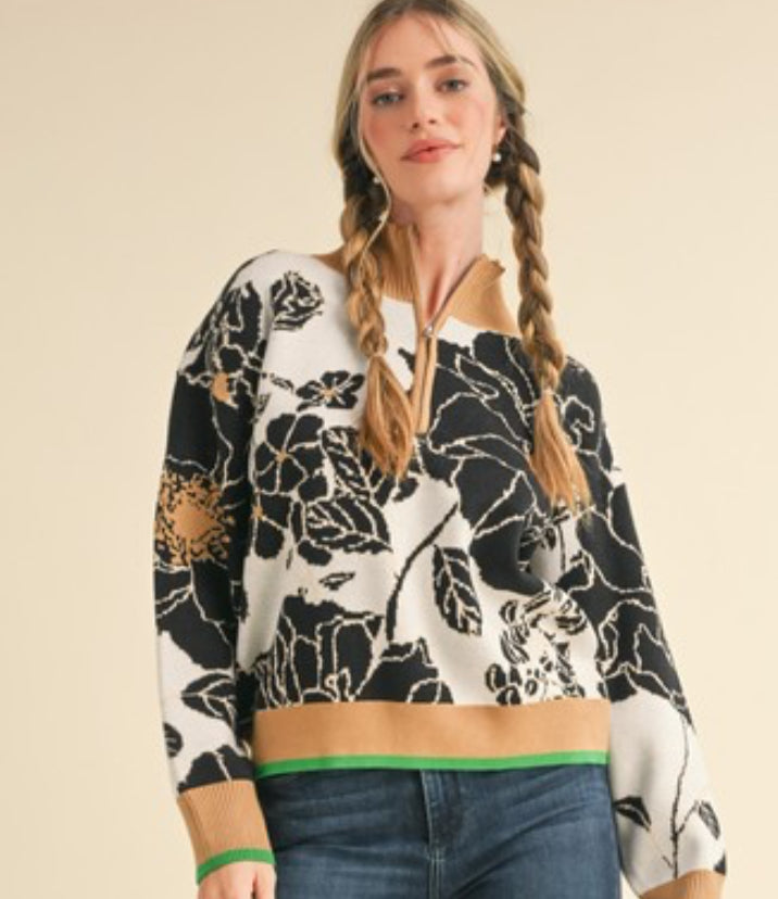 Camel & Black Knit Mock Neck Half Zip Sweater. Dropped shoulder with ribbed cuffs. Read more