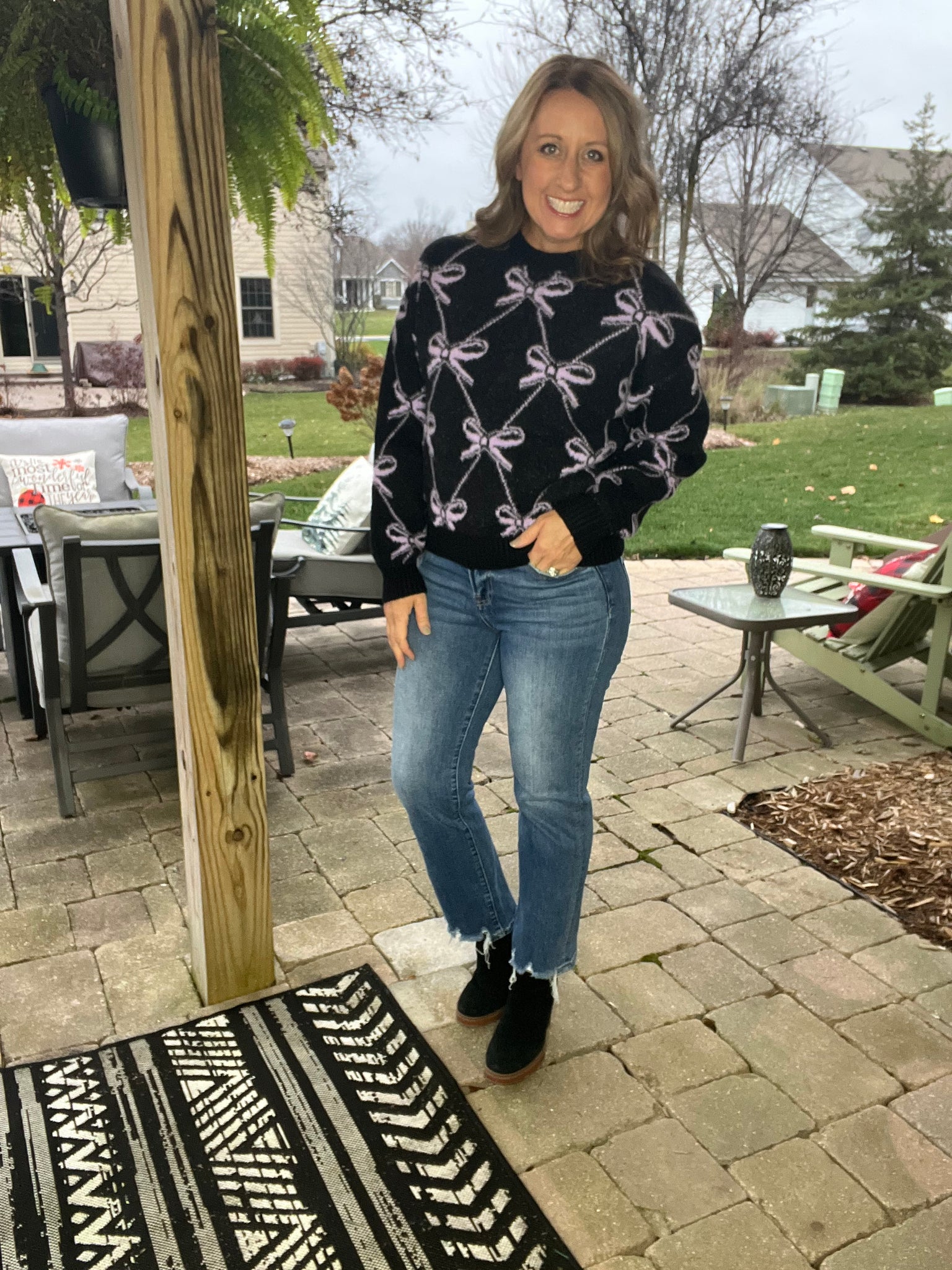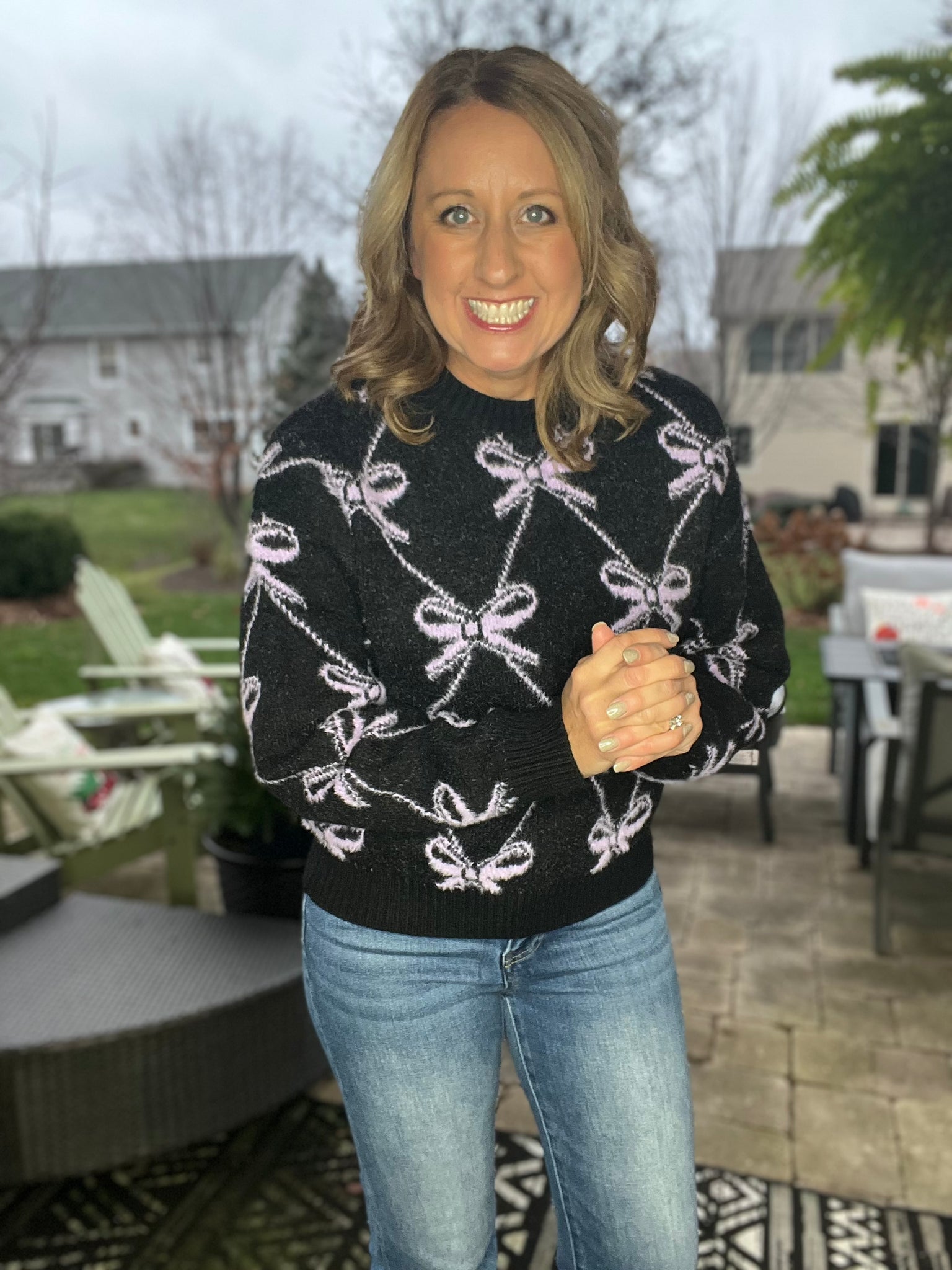 Black sweater with lavender print bows. Round neck, drop shoulder, ribbed cuffs.