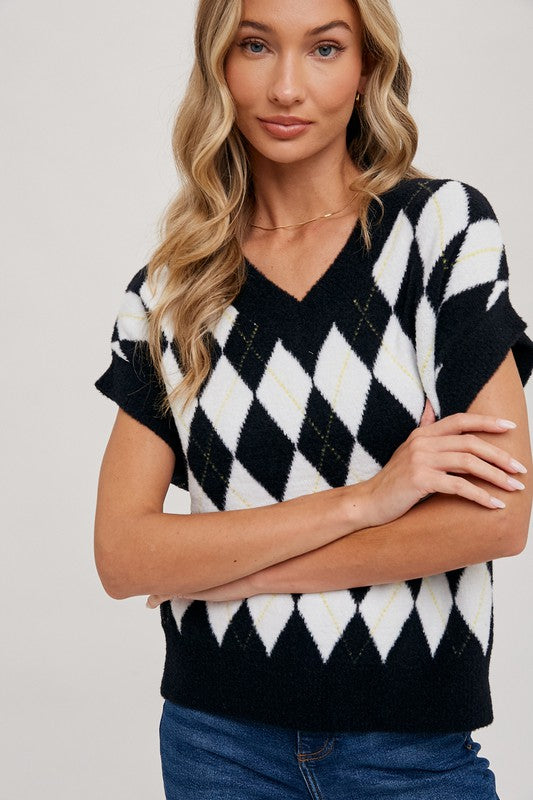 Timeless argyle pattern with v neck design. Short sleeve, waist length cut. Wear alone or layer. So cute!