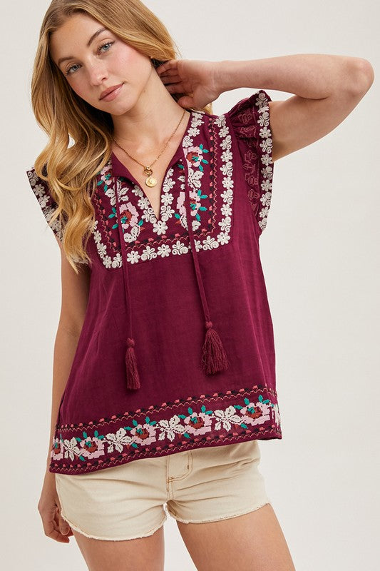 This boho inspired, beautifully embroidered top in plum is stunning. Ruffled sleeves add a feminine touch. Drawstring detail. Perfect with denim or dress it up with a skirt.