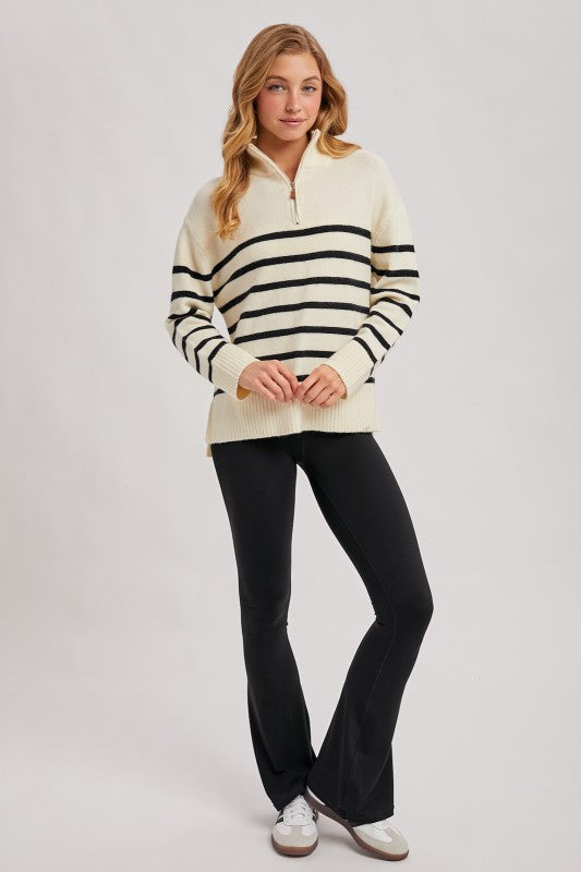Ivory with black stripes, quarter zip. Ribbed cuffs and hem. Classic and comfortable.