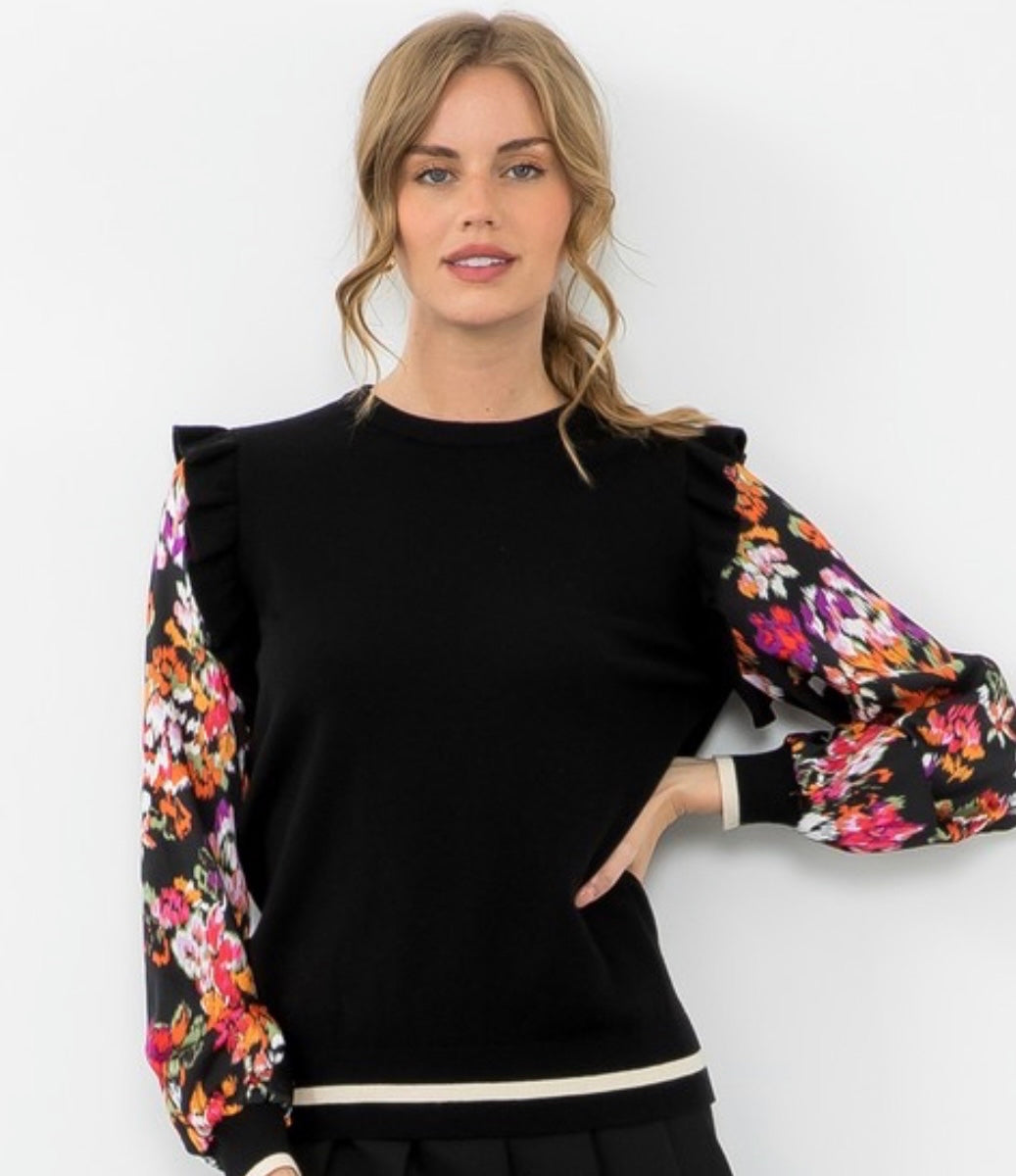 This stunning blouse features a black body with contrasting floral sleeves and the sweetest little ruffle shoulder! Absolutely beautiful and perfect for work, dinner or the holidays!