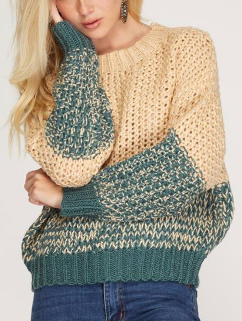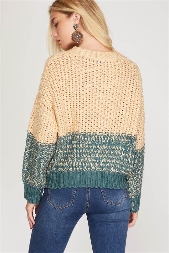 Long sleeve chunky knit sweater with contrast mixed media thread detail in a beautiful teal green.