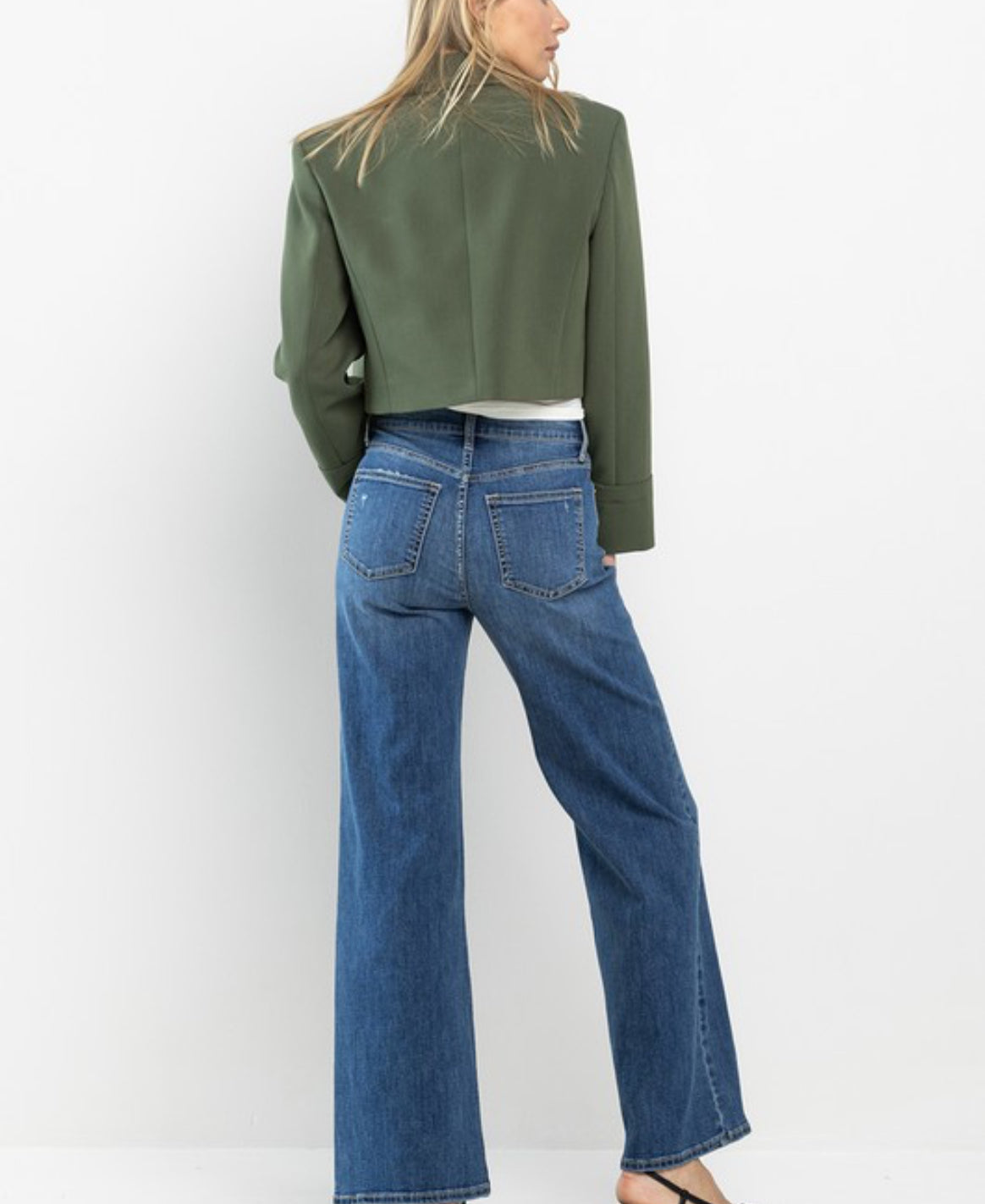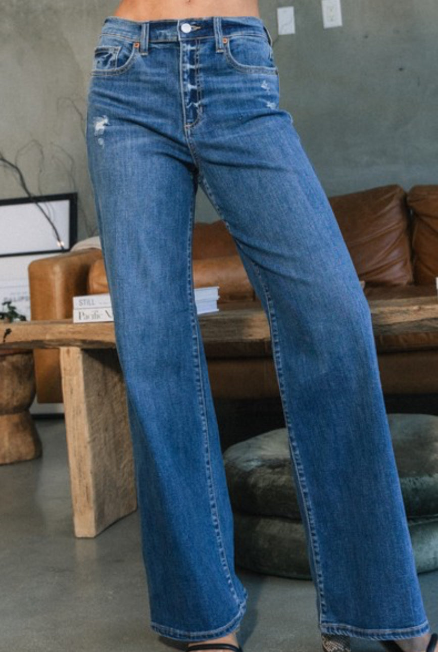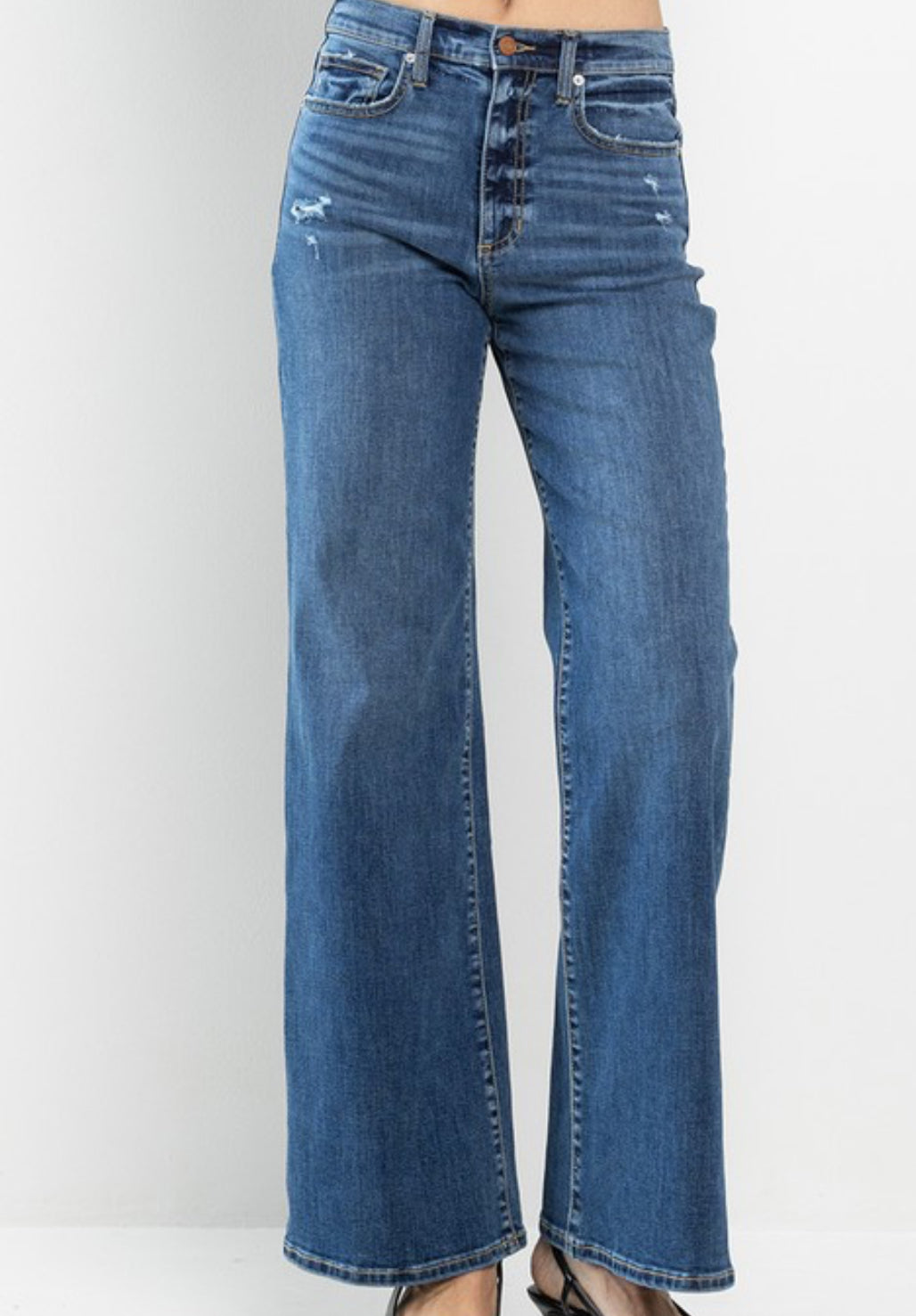 High Rise Wide Leg in a Medium Dark Wash. Inseam ~30” Great stretch.  May size down   77% Cotton, 16% Polyester, 5% Rayon, 2% SpandexRead more
